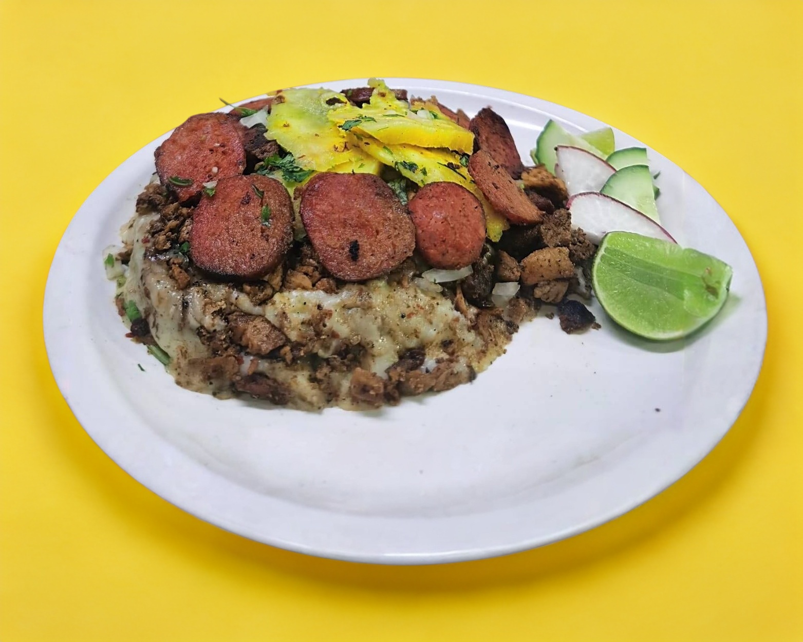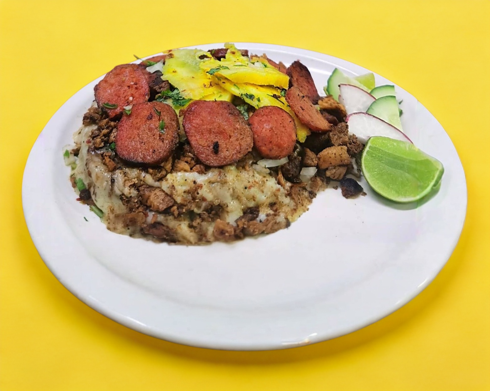 Deliciosa papa machacada preparada con los mejores ingredientes con una porción de queso, carne acompañada de tortillas y salsas.