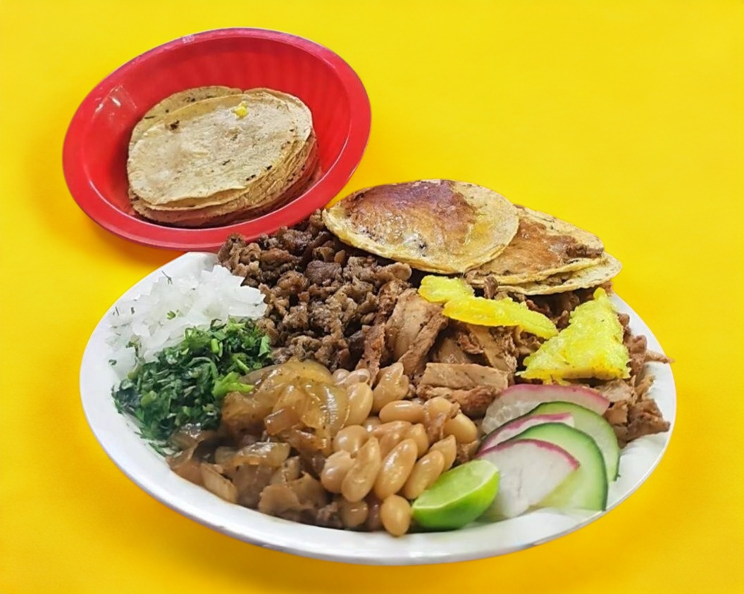 Deliciosa orden de carne con la mejor preparación y cocción para su agrado va acompañada de frijolitos, cebolla guisada, mini quesadillas y tortillas al igual que salsas.