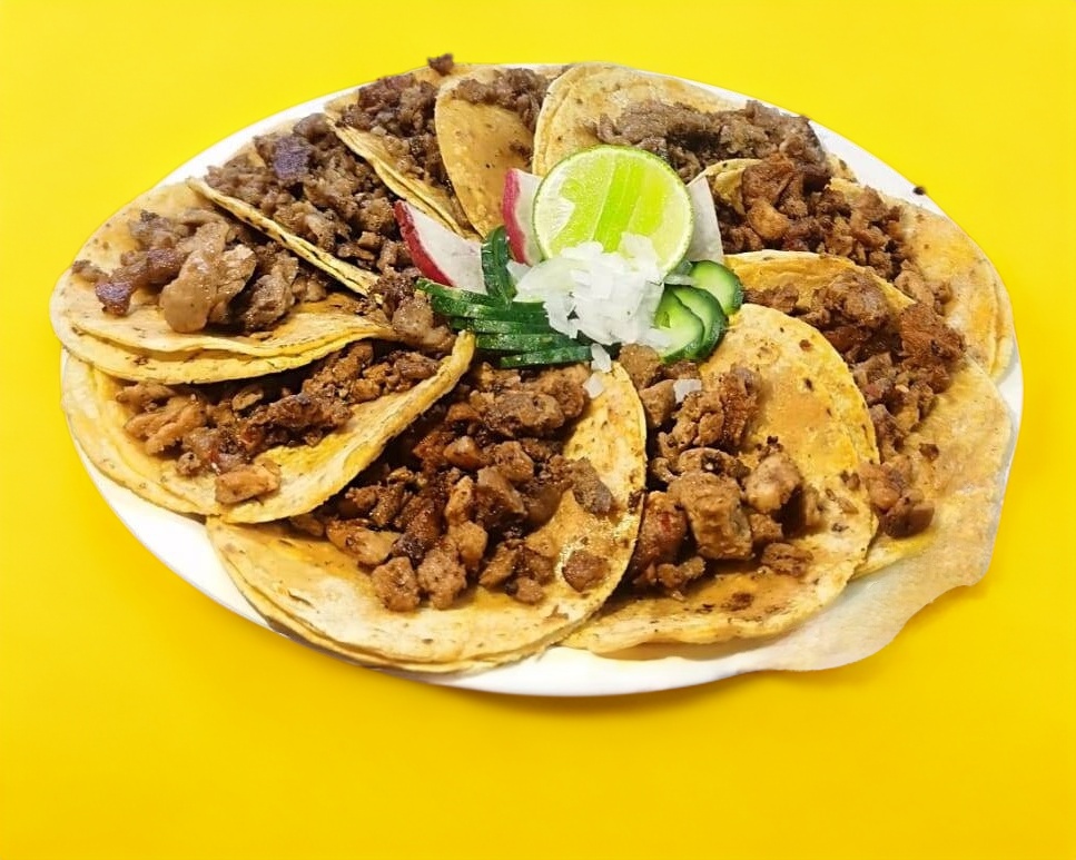10 Piezas de Deliciosos taquitos de maíz con carne a elección de la mejor calidad, incluye salsas y limones y cebolla