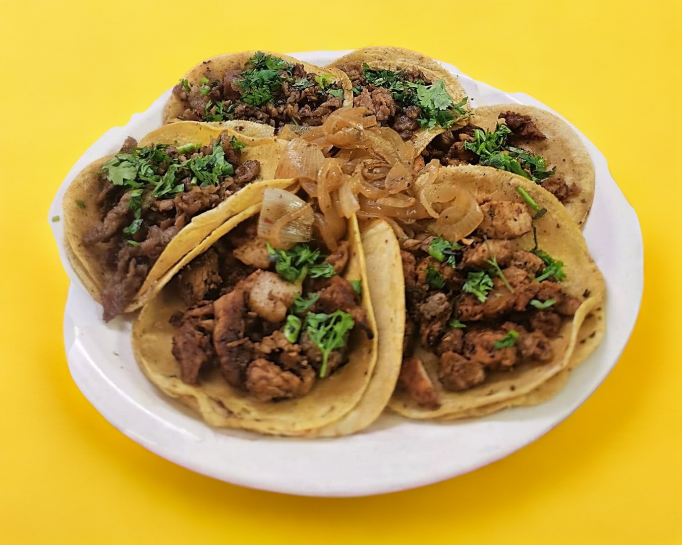 15 Tacos con carne de tu elección, hechos con tortilla de maíz taquera, proteína a elegir, salsa, cebolla y cilantro.