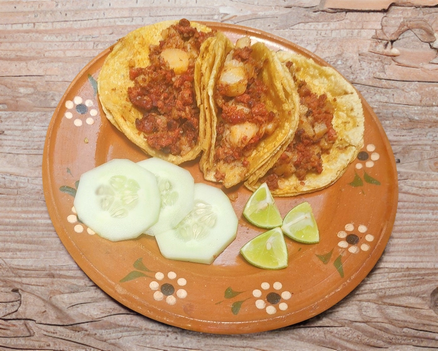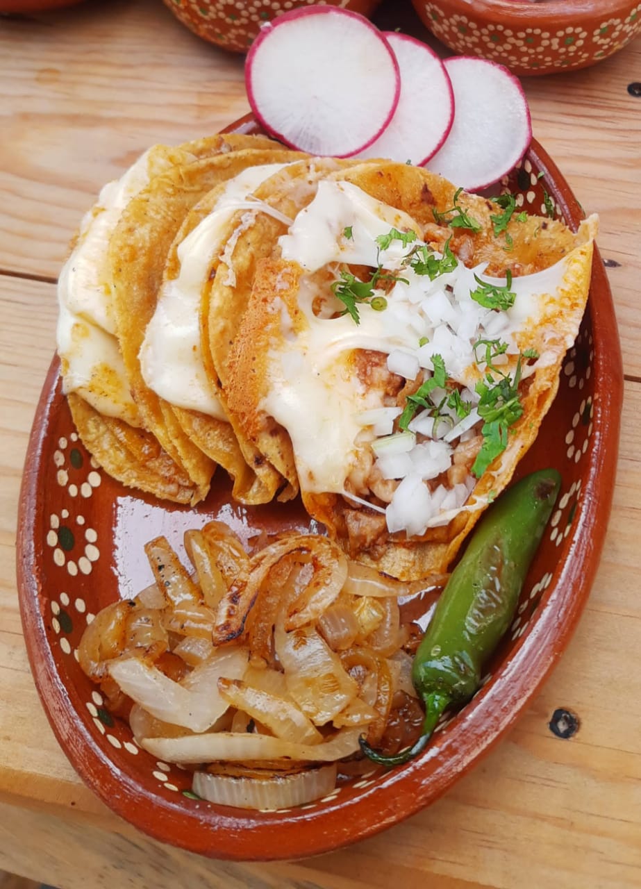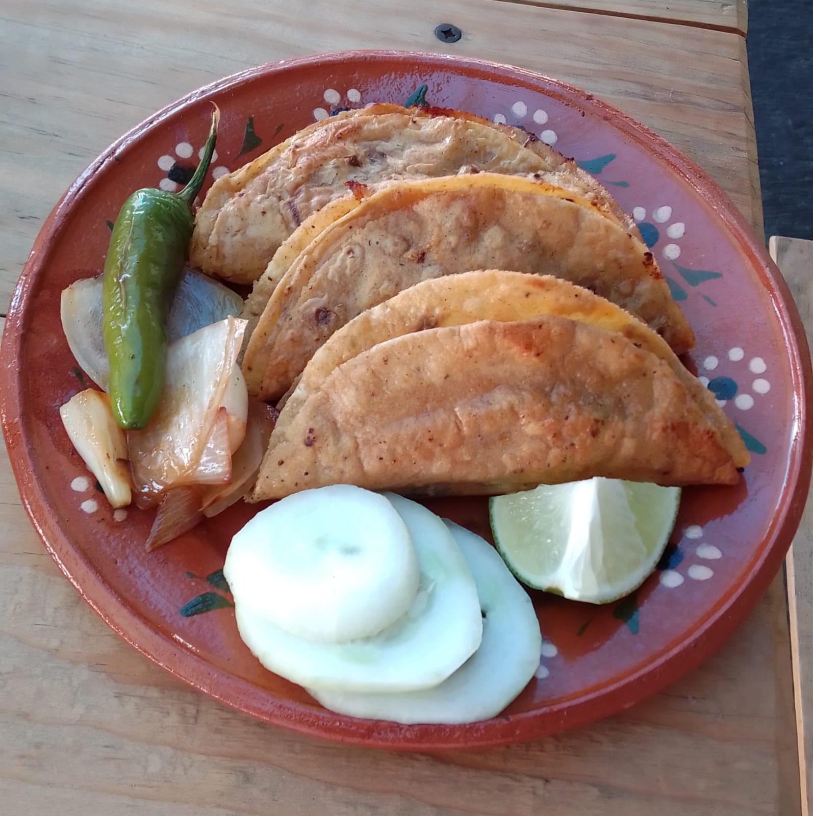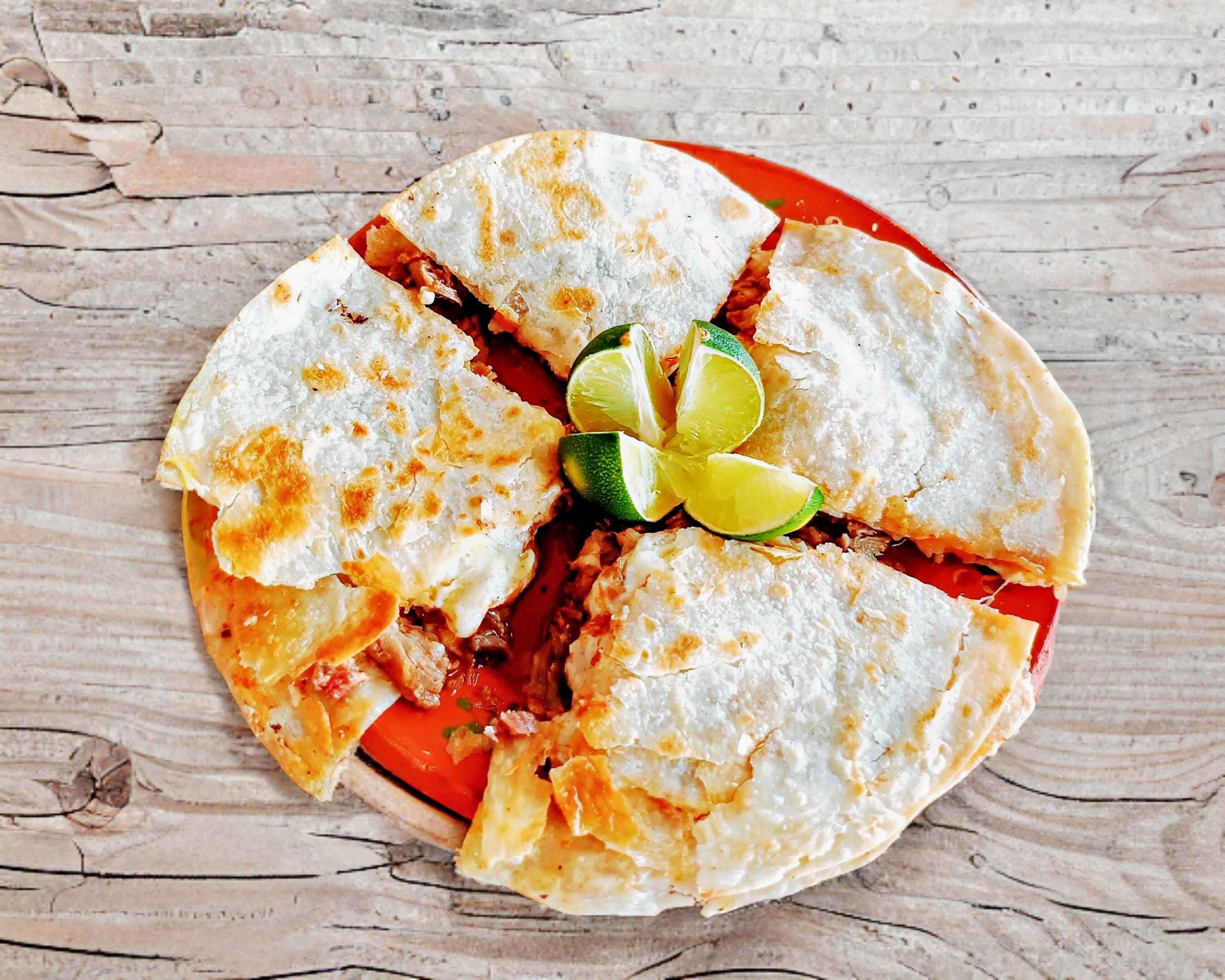 Porción personal: Tortilla de maíz dorado con carne de birria, salsas, verdura y guacamole.