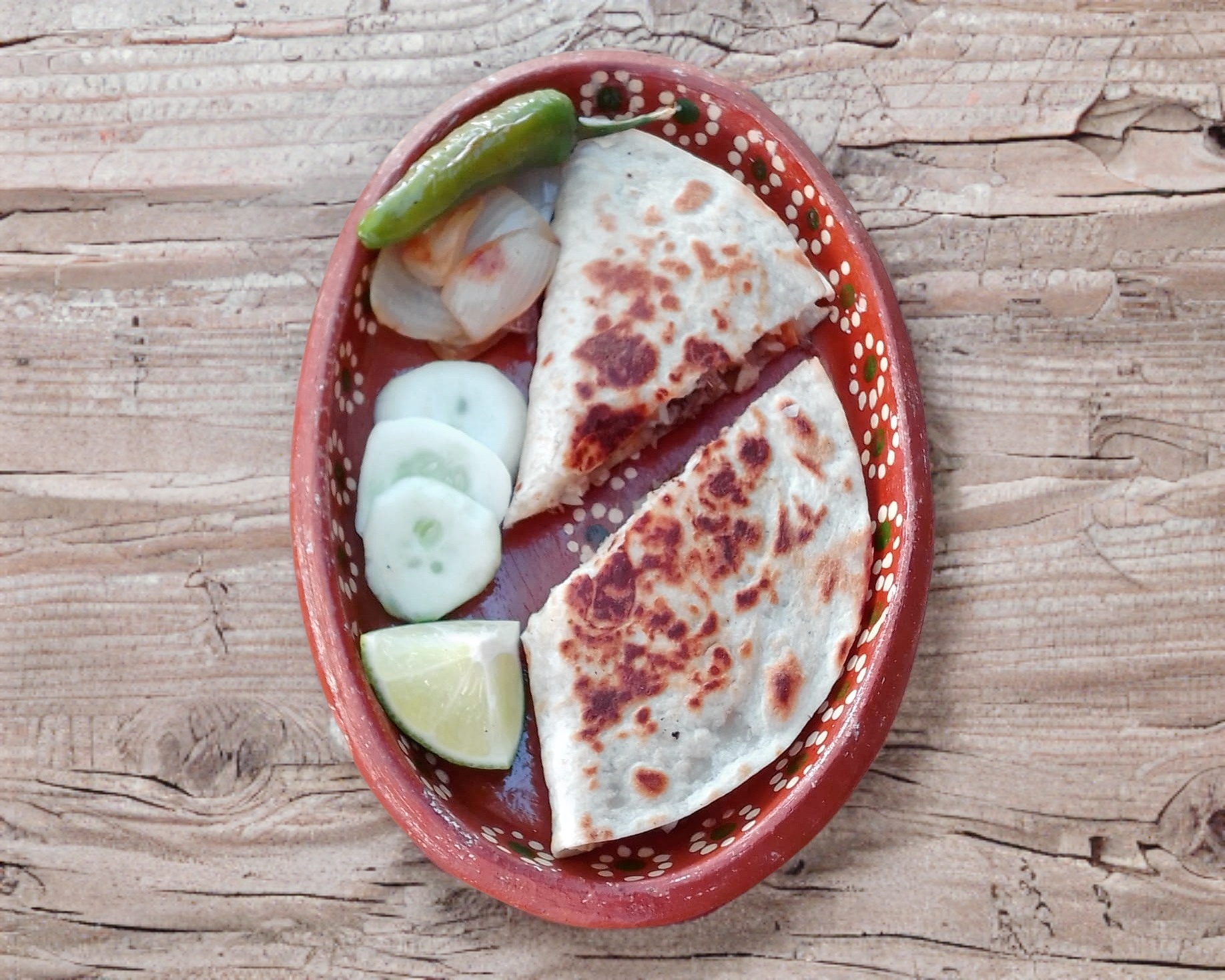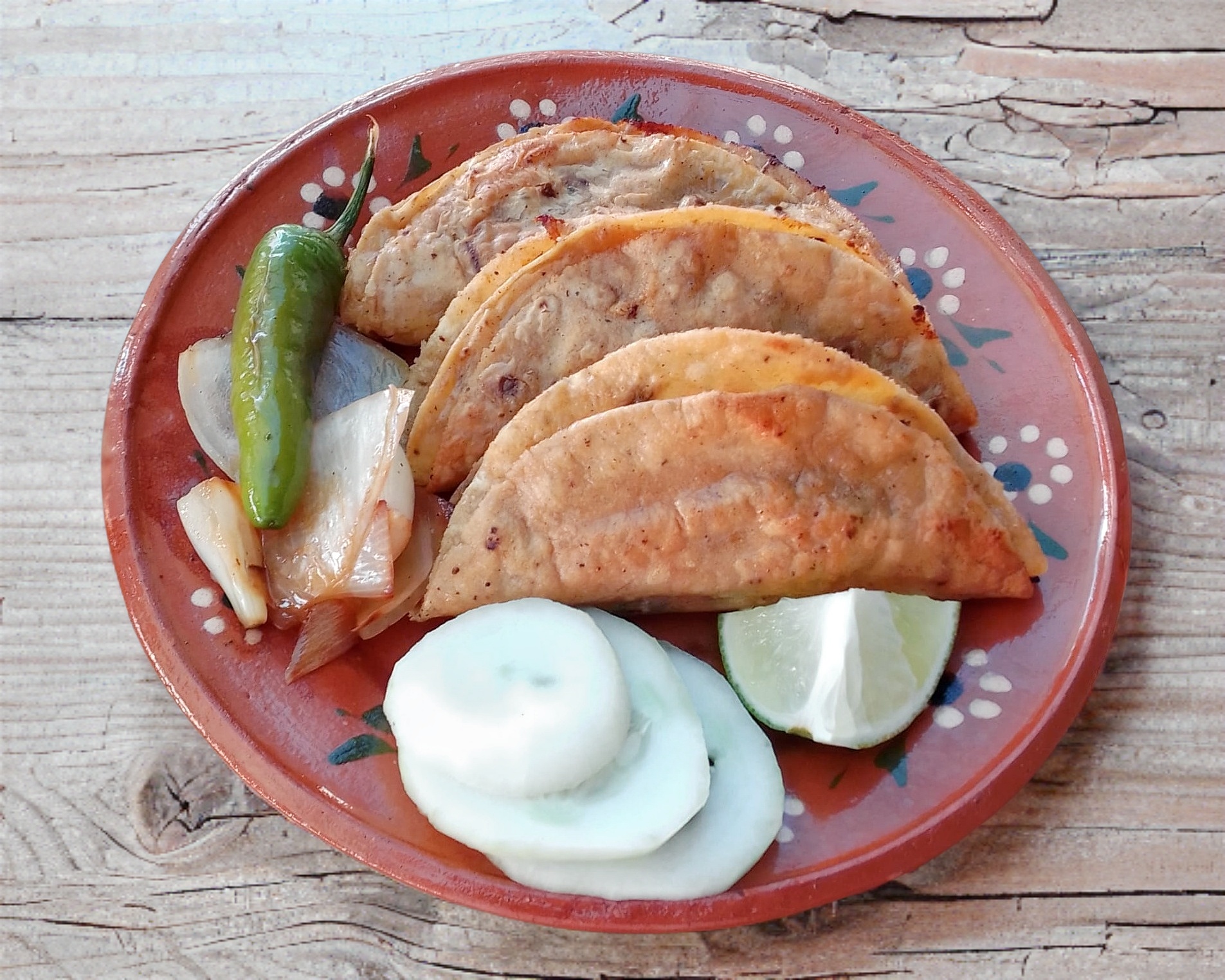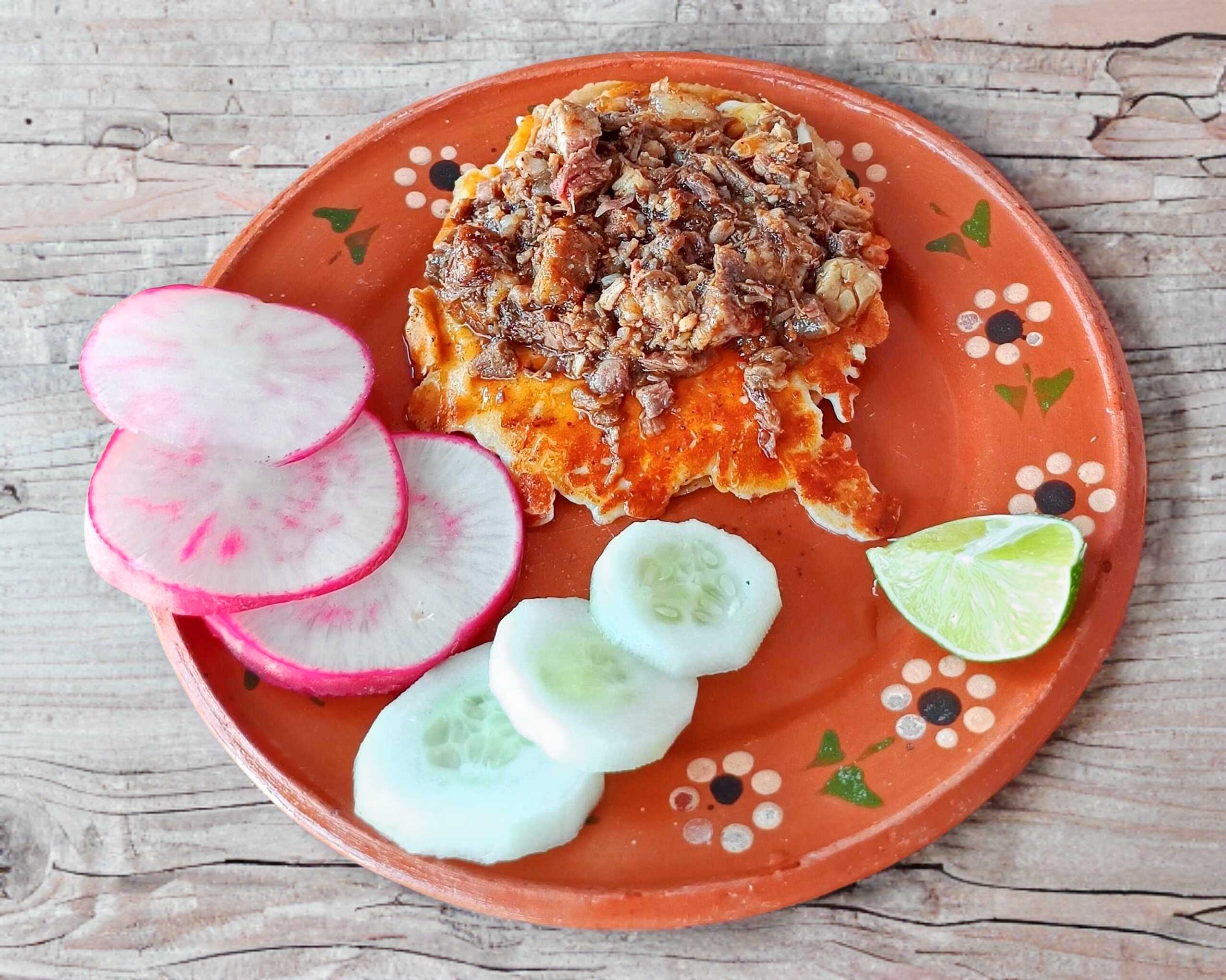 Porción personal: Tortilla de maíz dorado con carne de birria, salsas, verdura y guacamole.