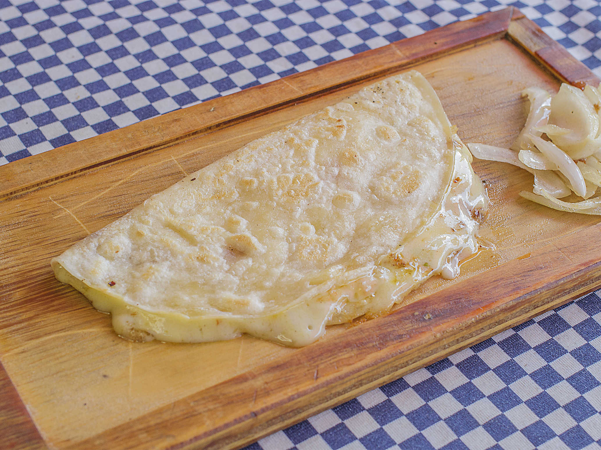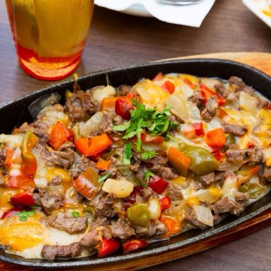 Bistec, chorizo, morron y queso + frijoles, cebolla, cilantro, cebolla asada, chie asado, tostadas y tortillas