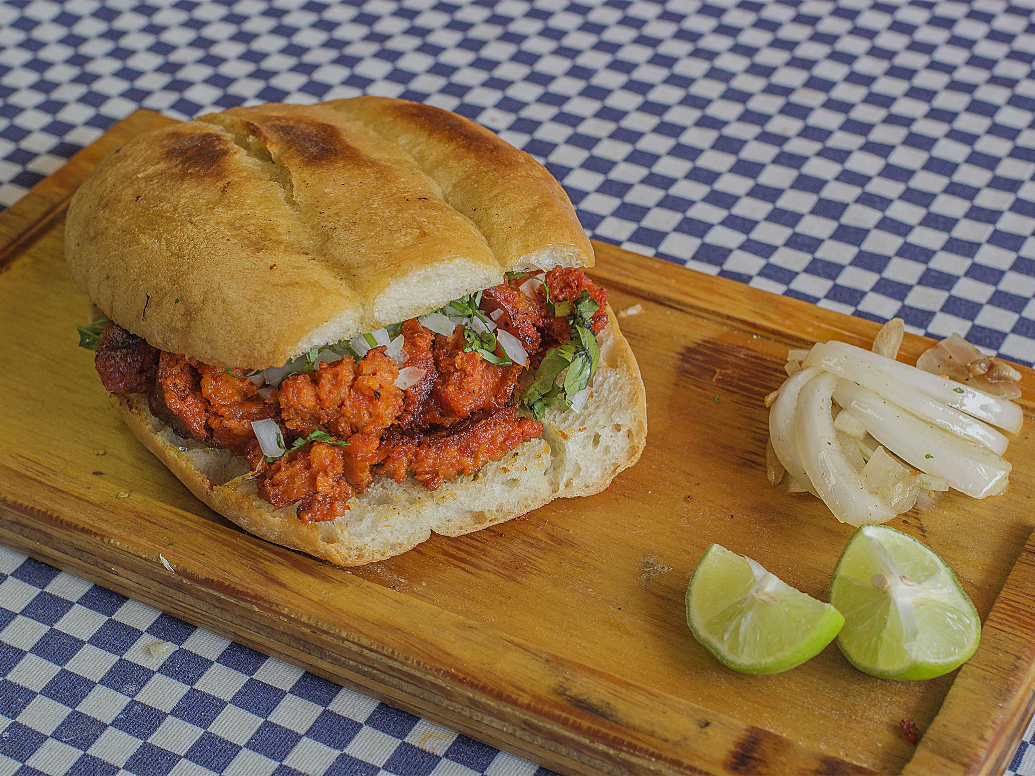 Bollo Brioche, Arrachera de Res Marinada, Luchuga, Jitomate, Cebolla, Aguacate y Queso