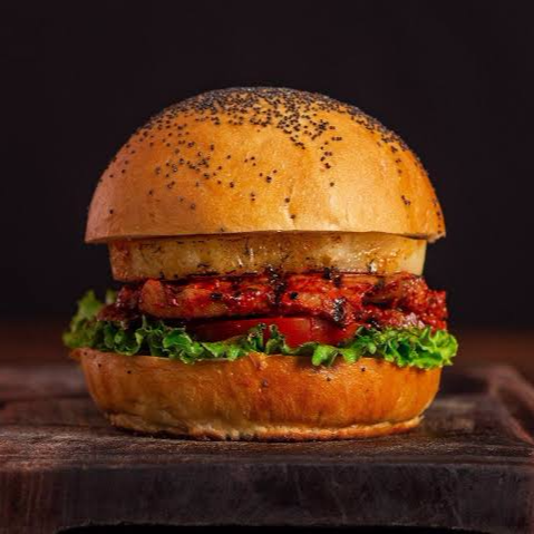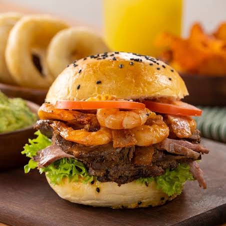 Bollo Brioche, Carne de Res marinada, Media Docena de Camarones, Tocino, Luchuga, Jitomate, Cebolla, Aguacate y Extra Queso