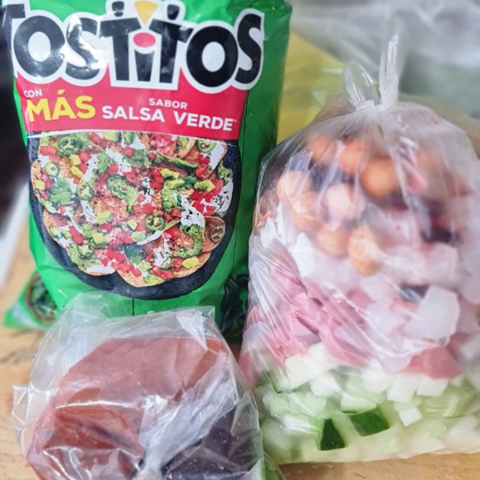 Tostitos preparados con cueritos, salchicha, pepino, jícama, cacahuate japonés y tortolitos, acompañado un preparador salsas negras