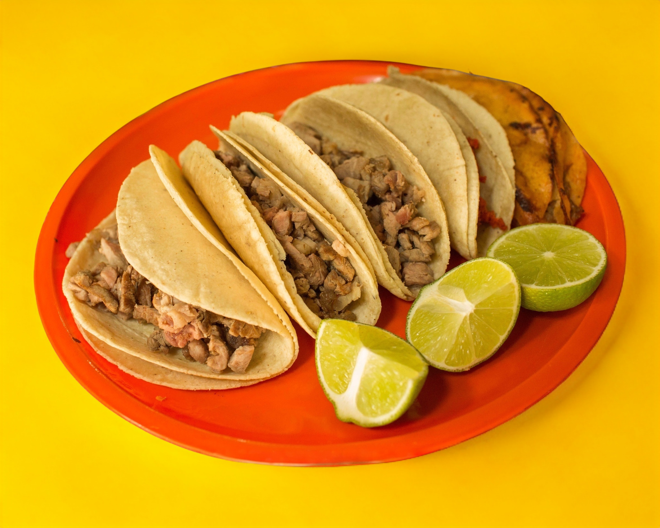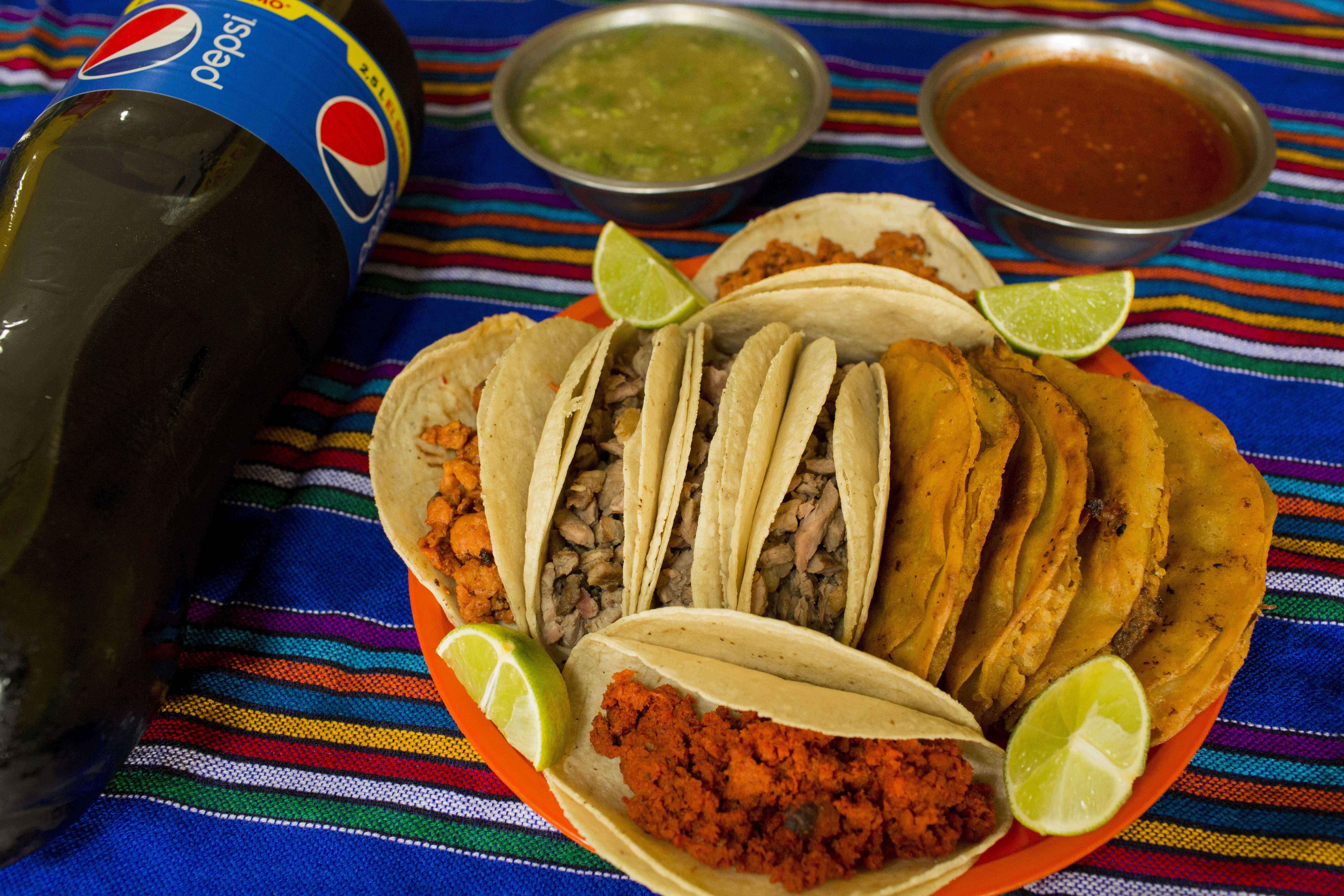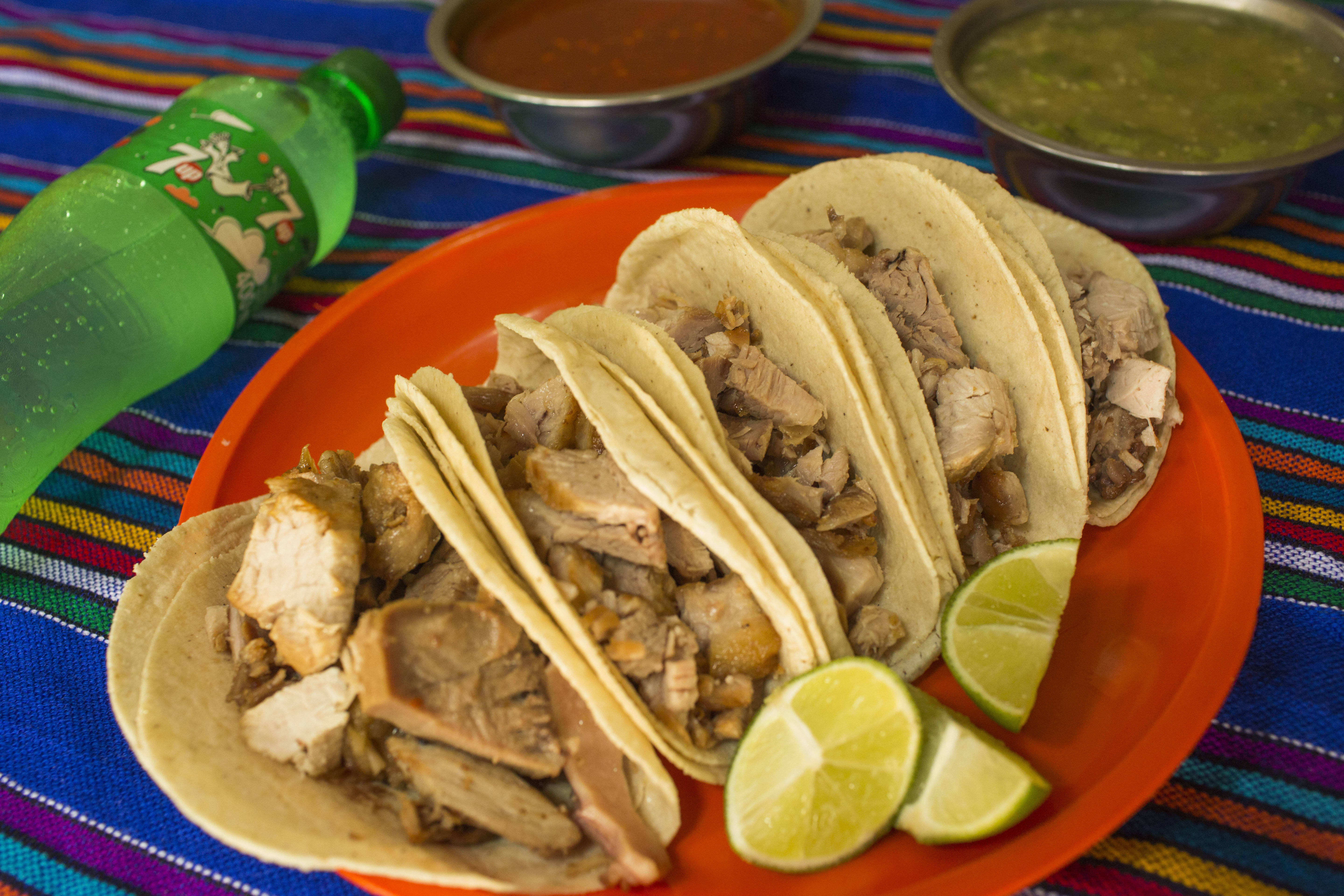 5 Tacos con doble tortillas de maíz, con las carnitas de tu elección, acompañado de cebolla, pepino, guacamole y salsas. + Refresco de 400 ml sabor según disponibilidad*1