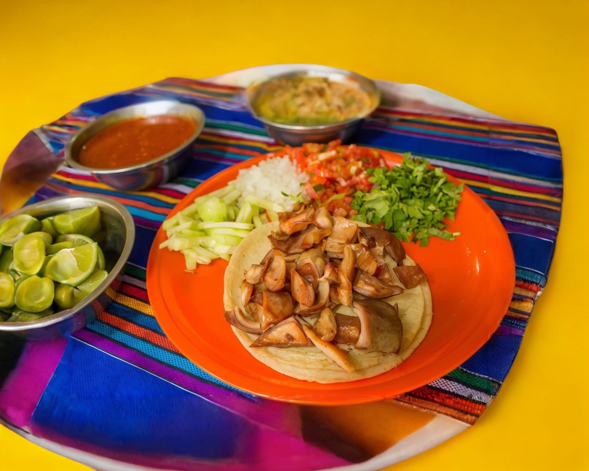 1 Taco con doble tortilla de maíz, con la carne de tu preferencia, acompañado de cebolla, pepino, guacamole y salsas.