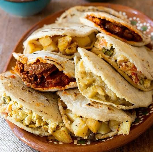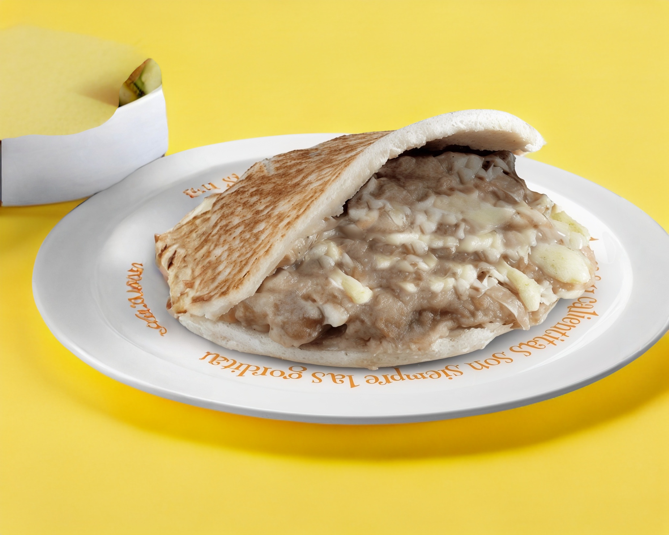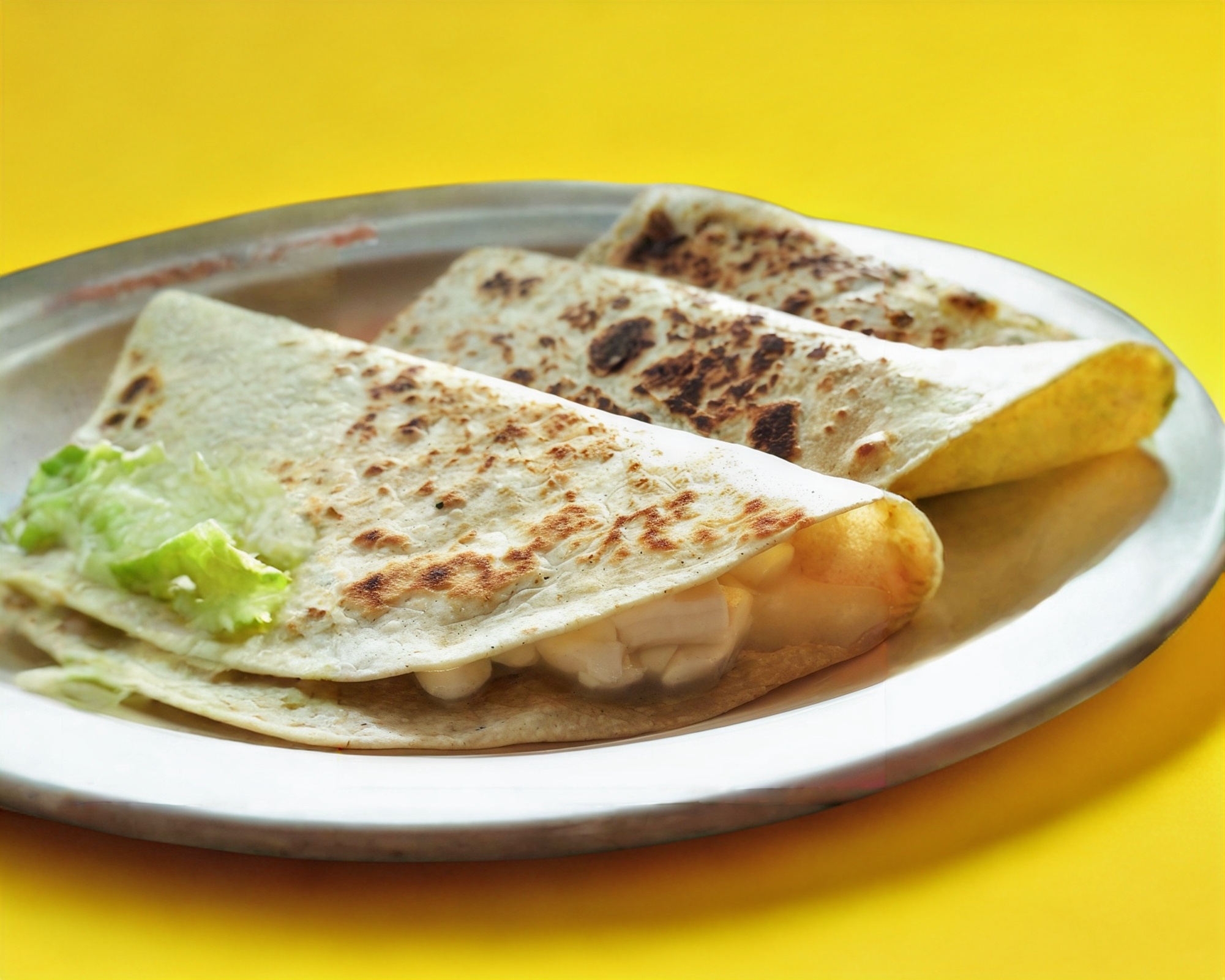 Tortilla de maíz hecha a mano, rellena de queso derretido y acompañada de salsas