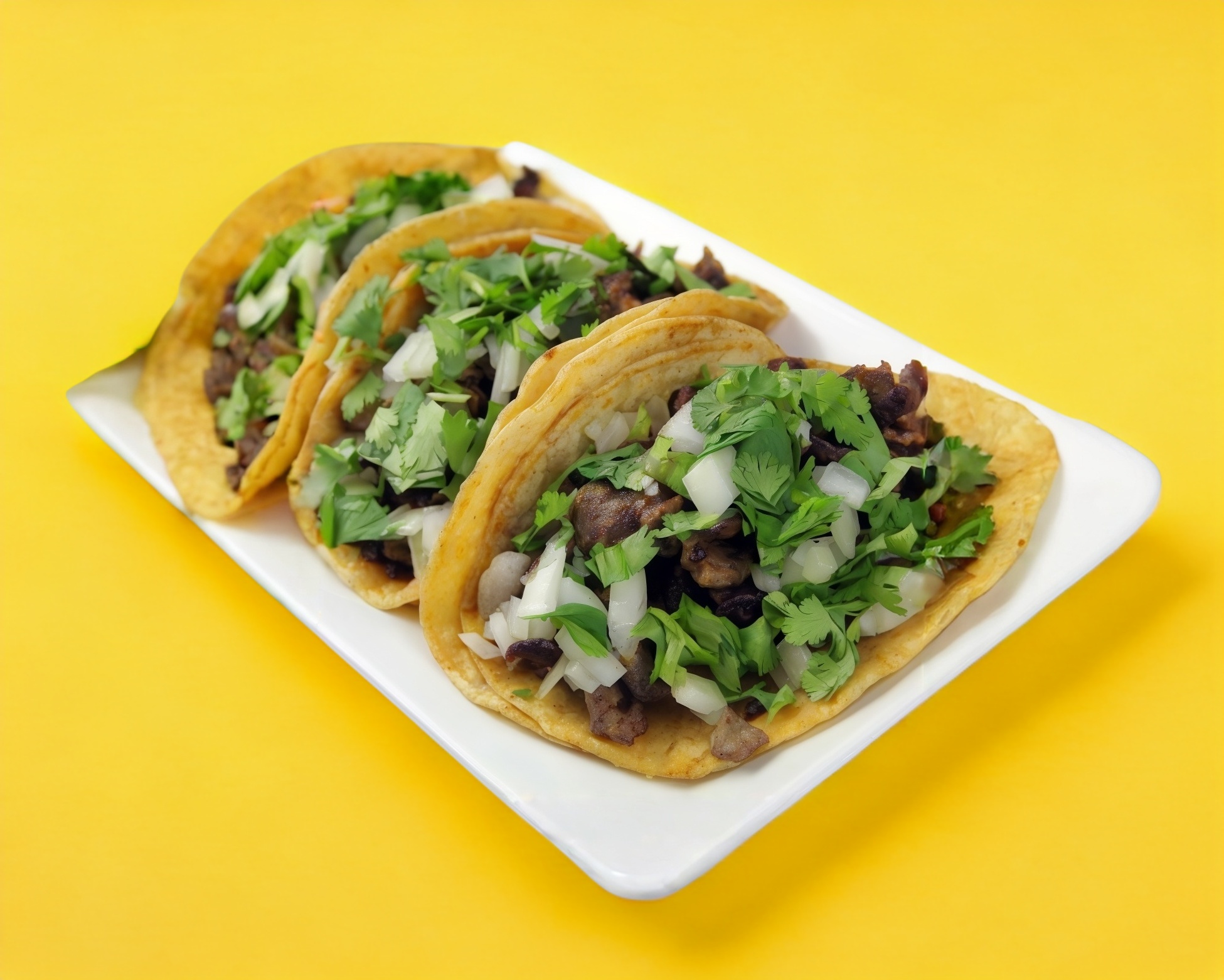 Taco de tortilla de maíz relleno de bistec a la plancha, con cebolla, cilantro y salsa