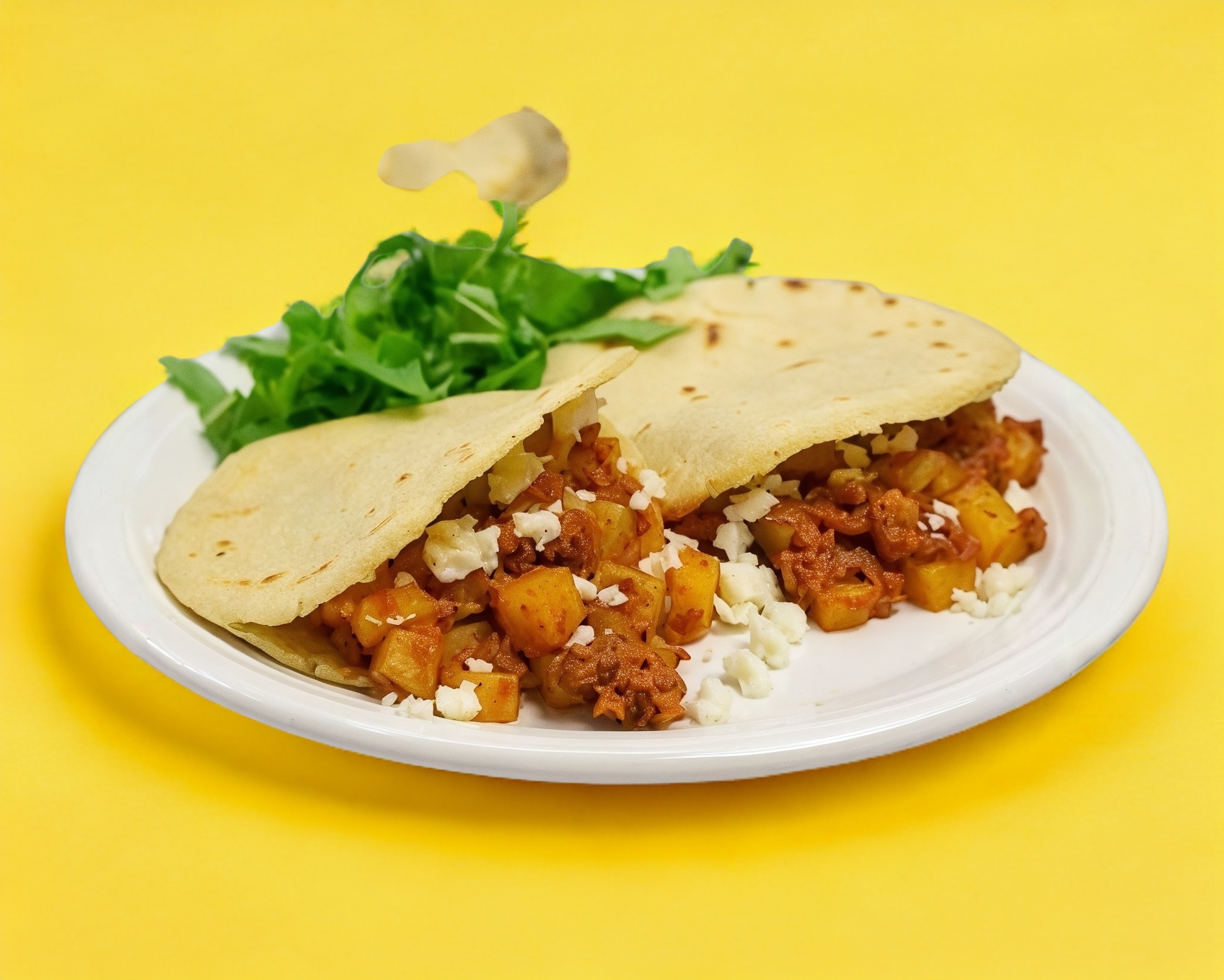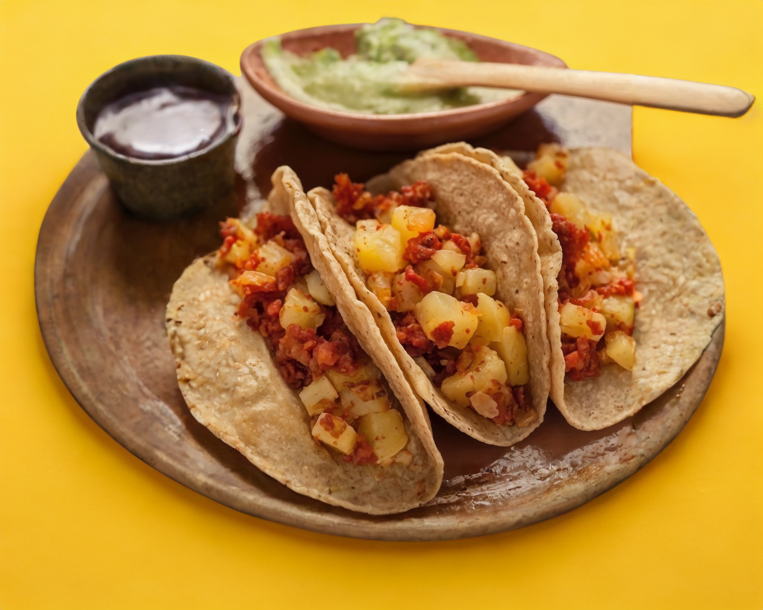 Taco de tortilla de maíz relleno de papas guisadas con chorizo, acompañado de cebolla, cilantro y salsa