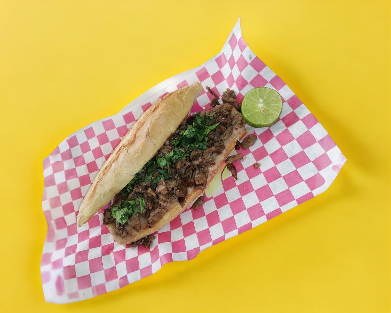 Bolillo relleno de bistec y chorizo doradito, acompañado de cebolla, cilantro y salsas