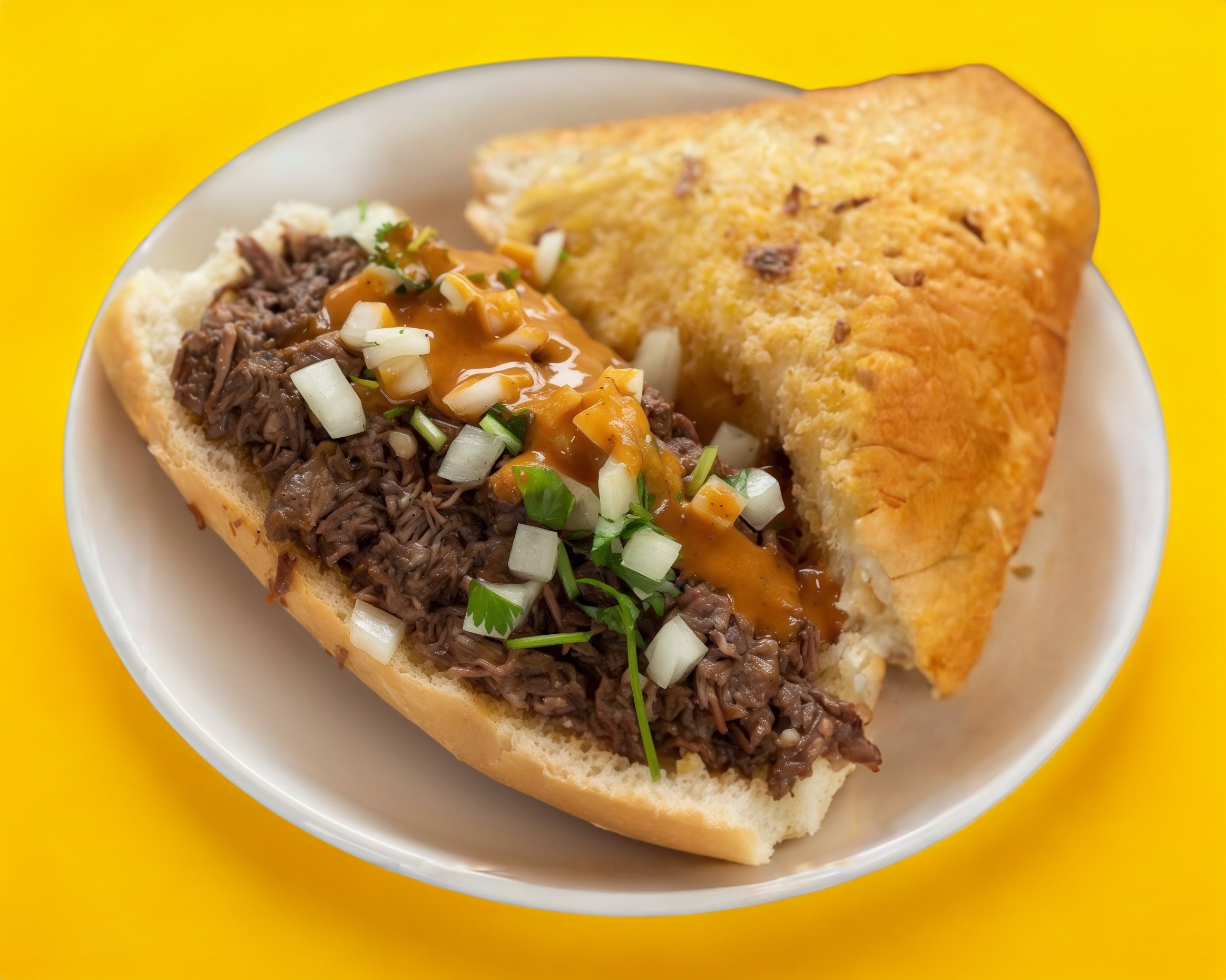 Bolillo relleno de barbacoa jugosa, con cebolla, cilantro y salsas