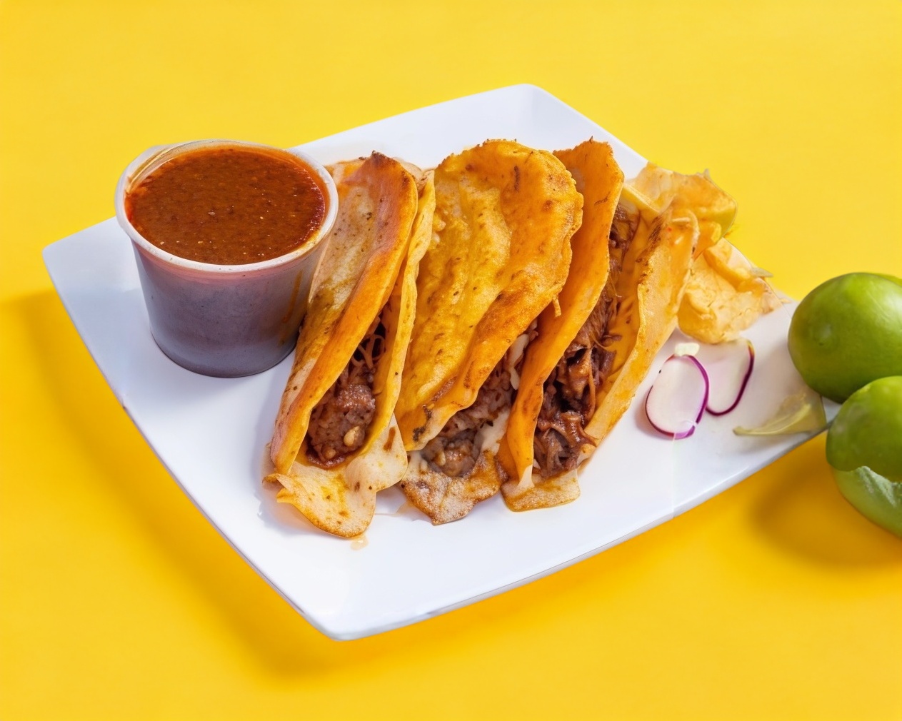 Taco de tortilla de maíz relleno de chorizo doradito, acompañado de cebolla, cilantro y salsa