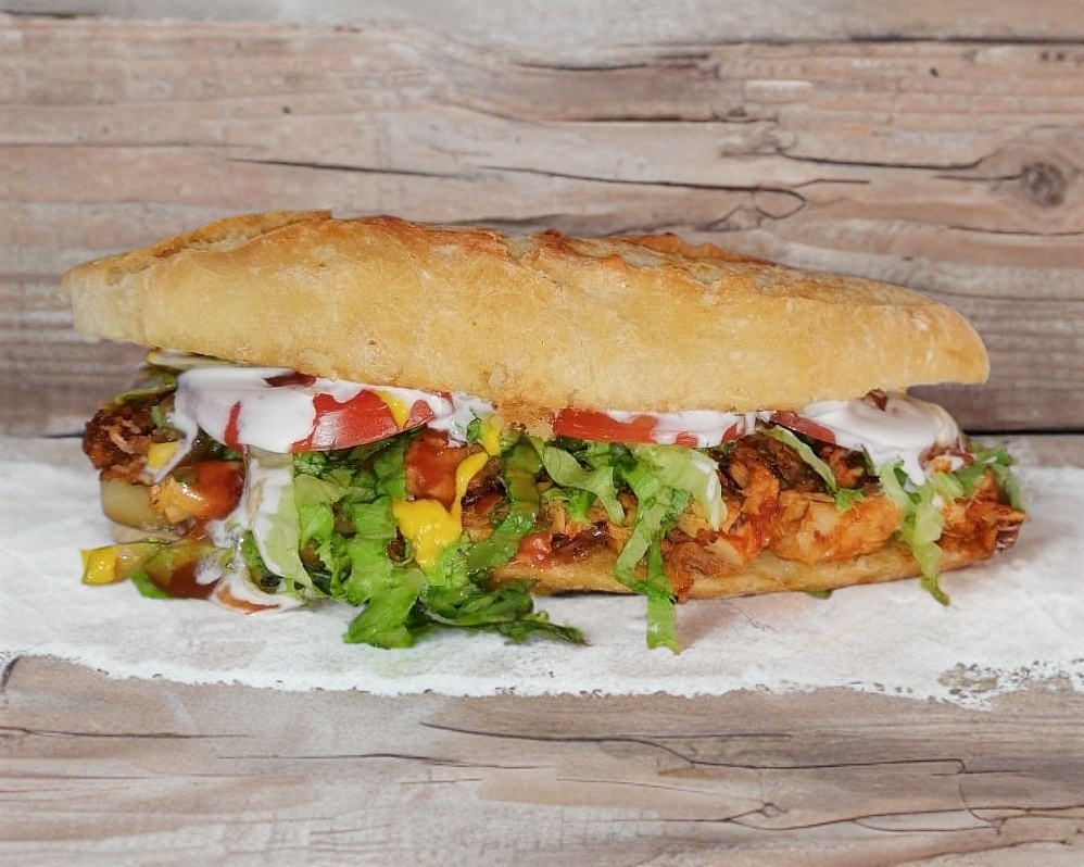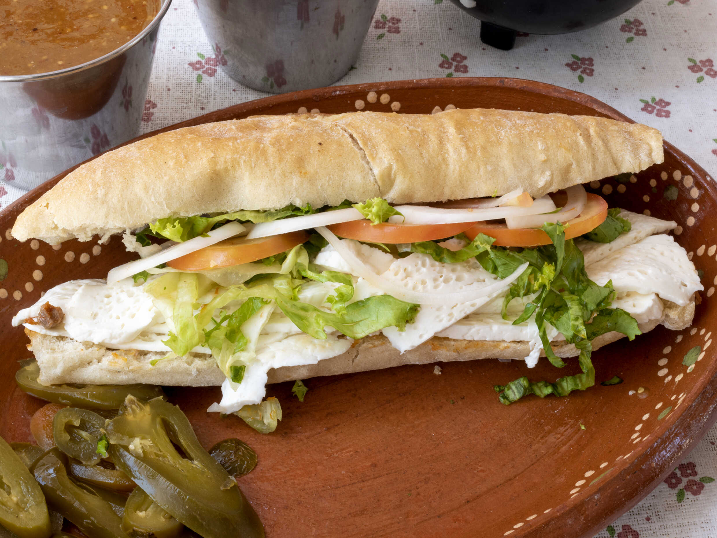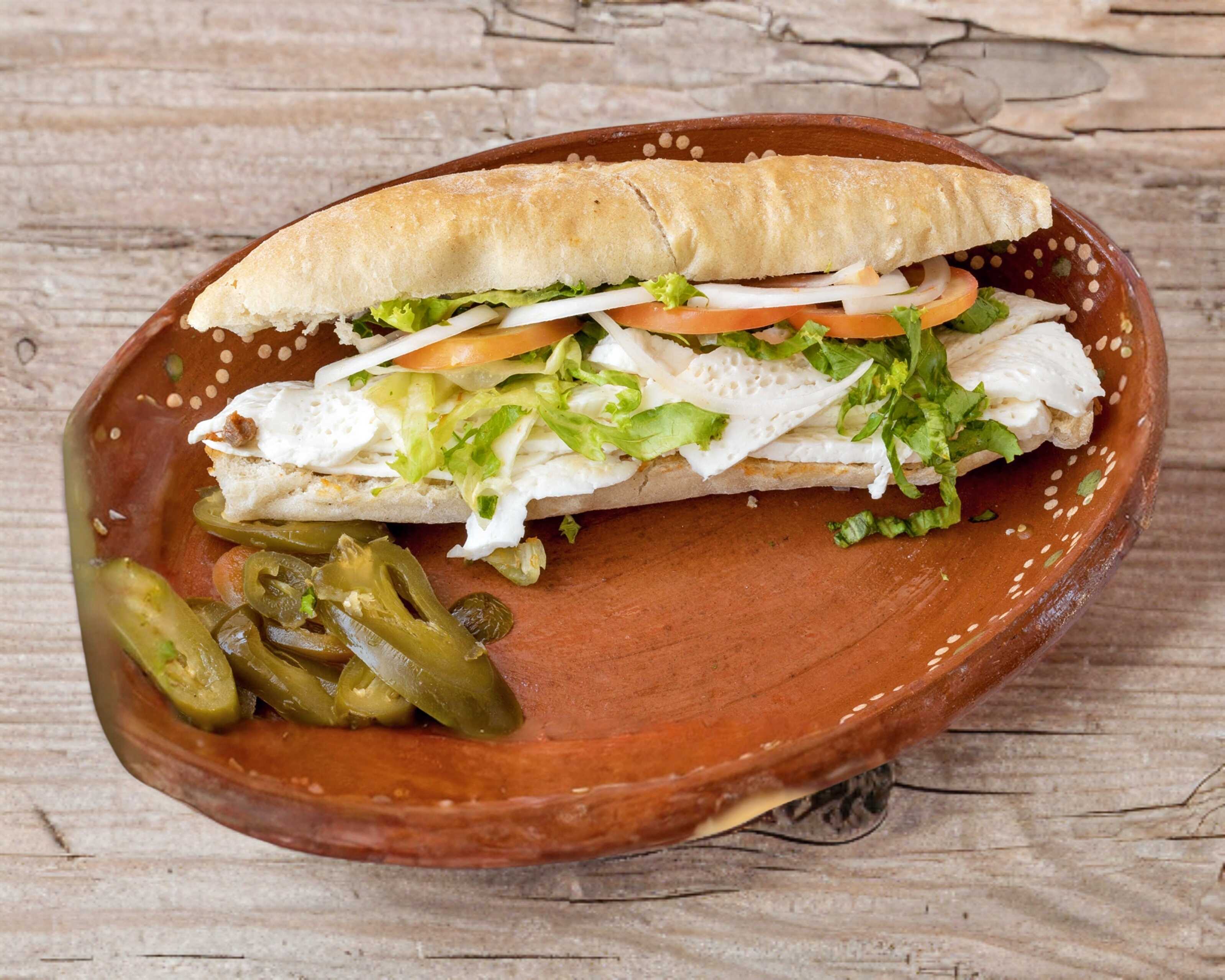 Lonche de panela este contiene crema, panela lechuga jitomate cebolla aguacate chiles jalapeños catsup y mostaza