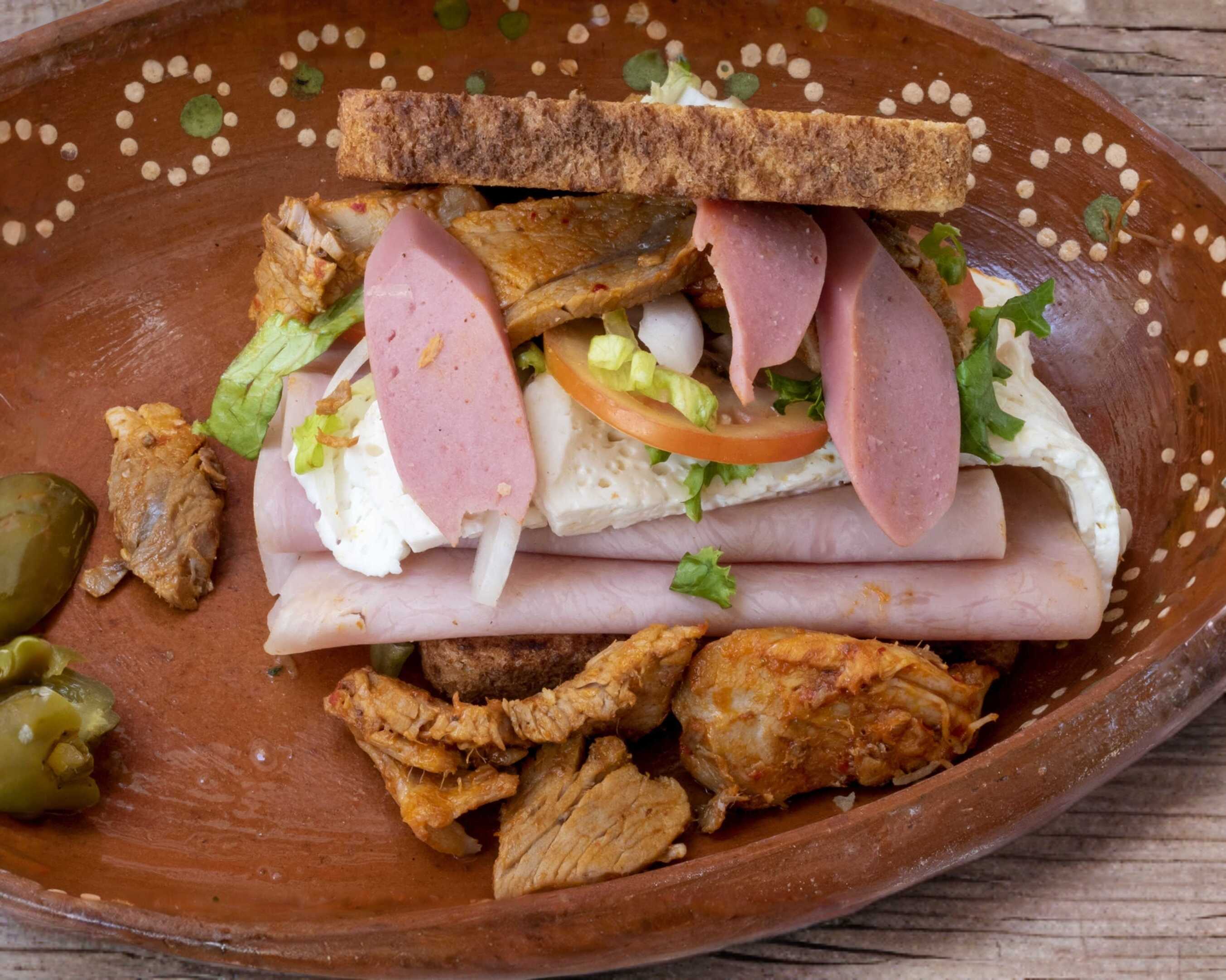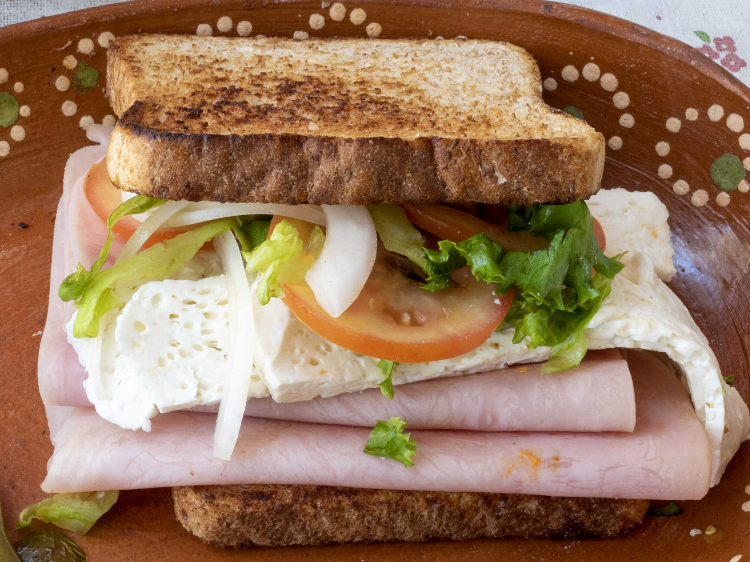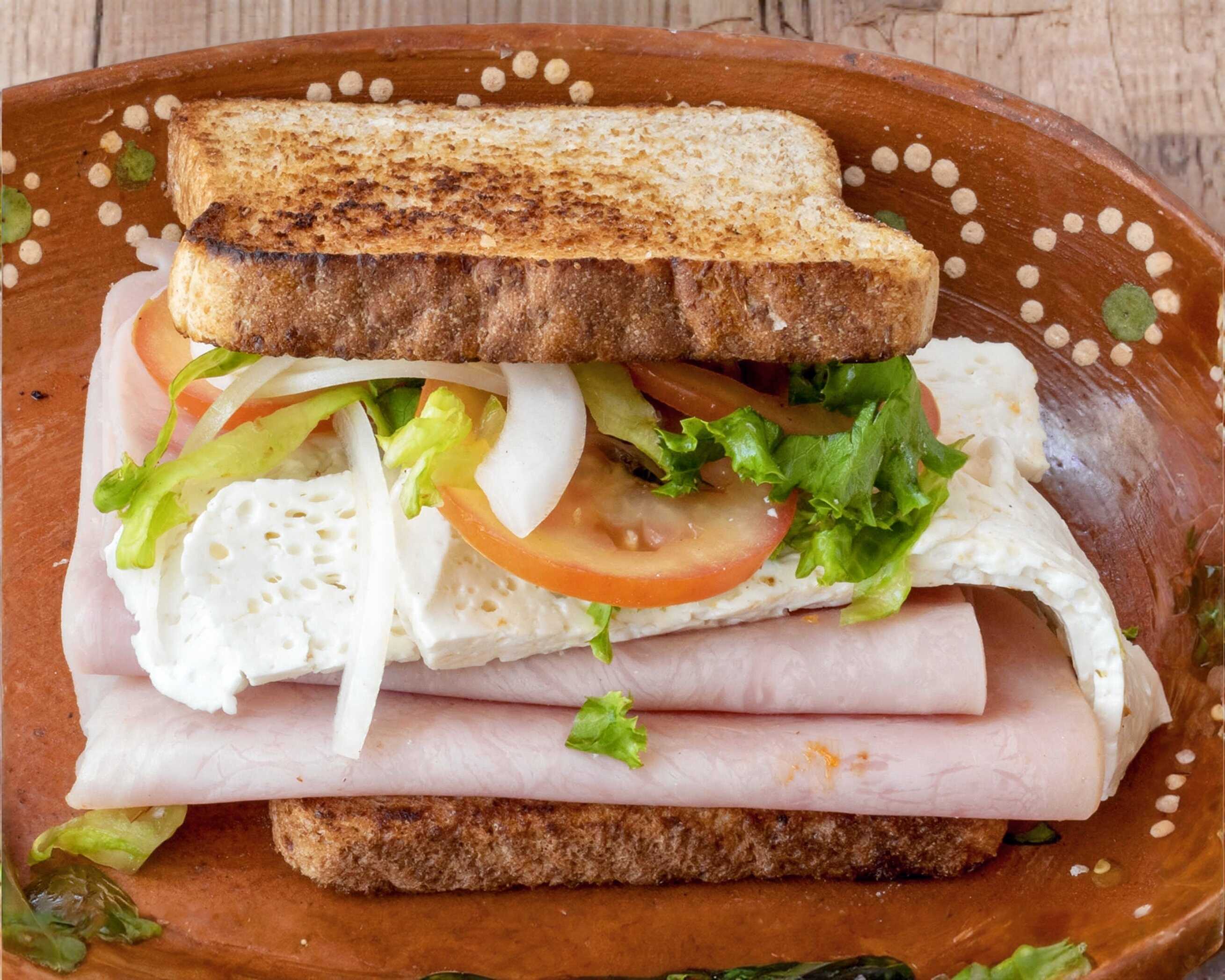 Este sándwich contiene: pan Bimbo integral, crema, jamón, panela, jitomate, cebolla, chiles jalapeños, aguacate, catsup y mostaza