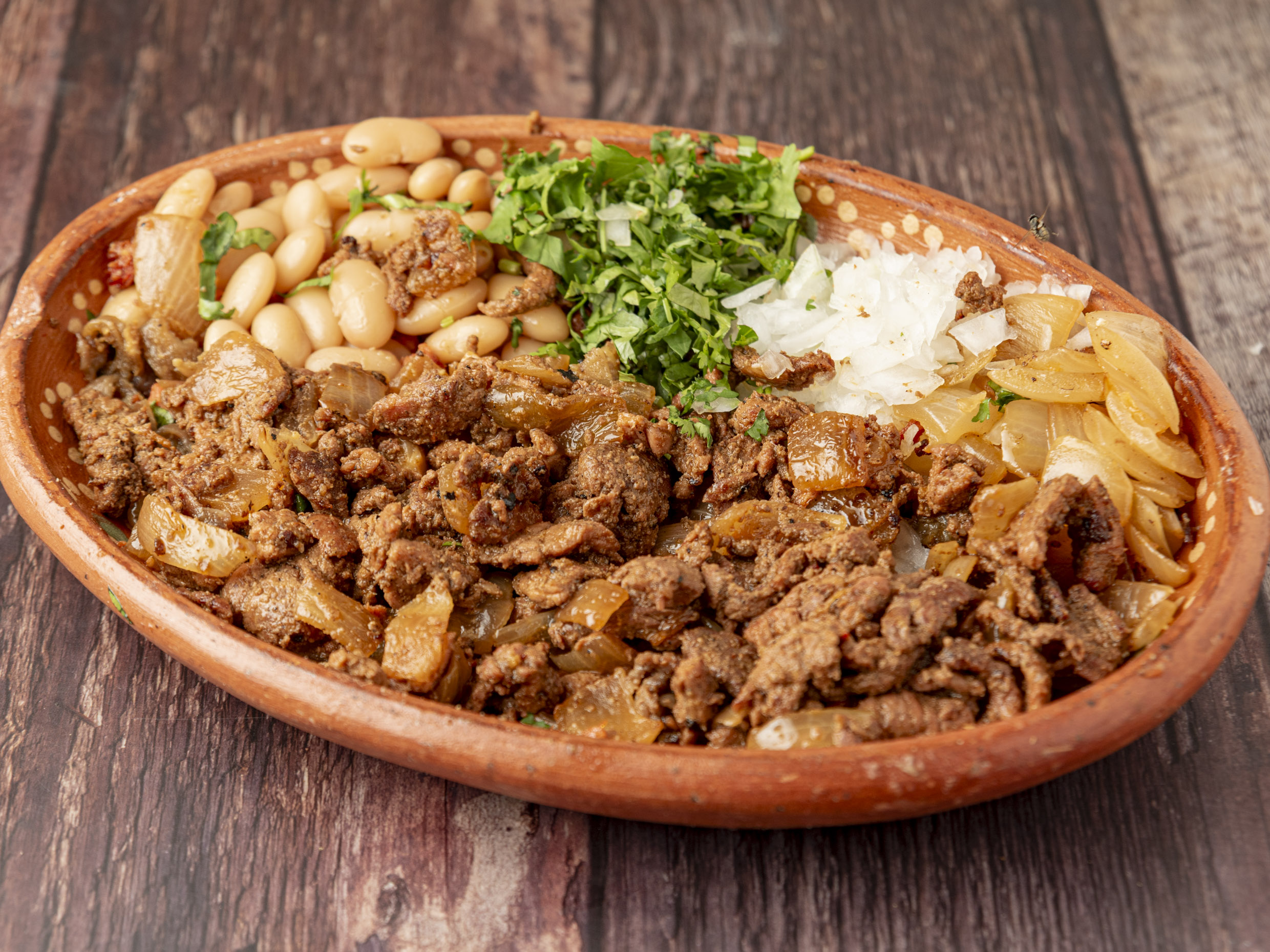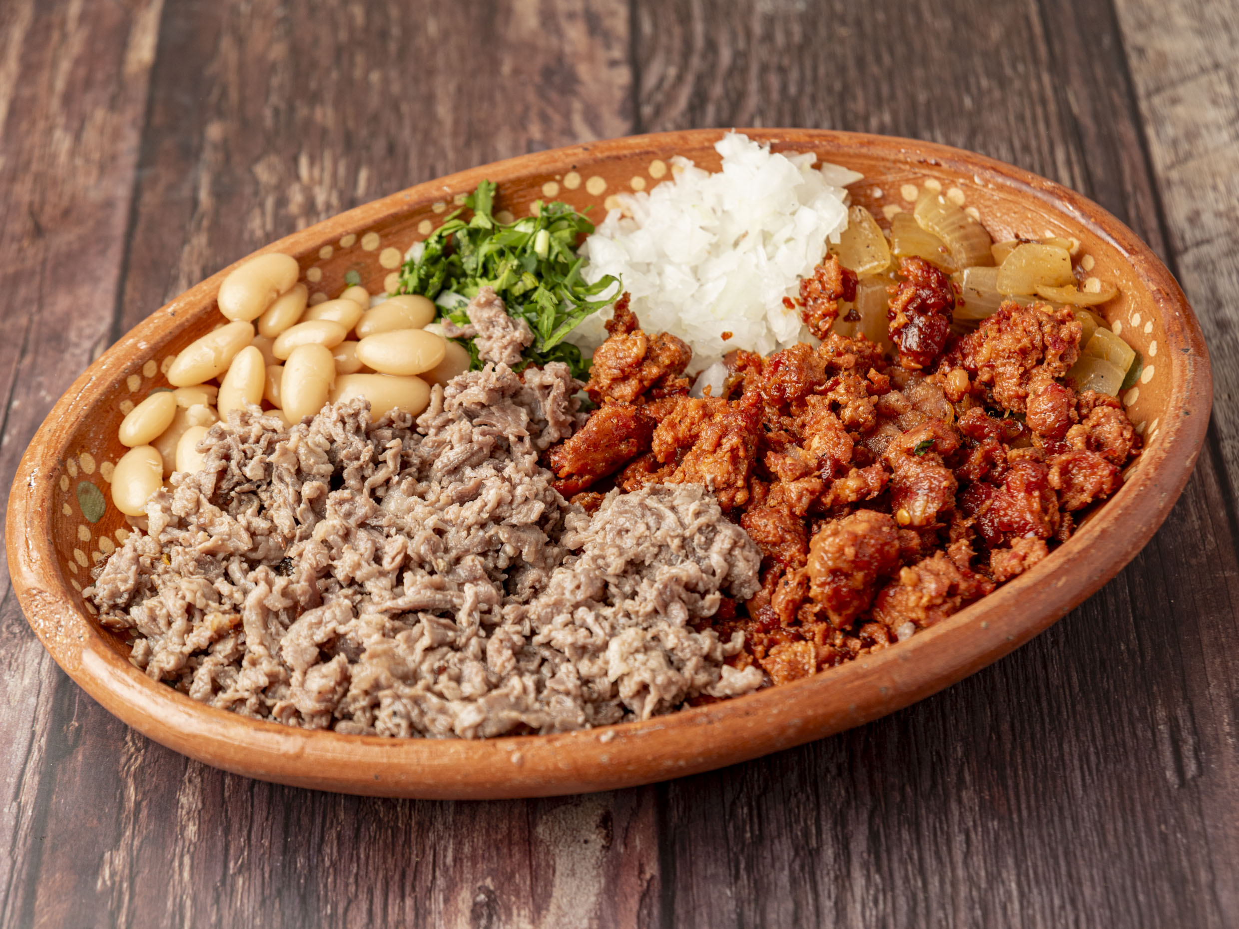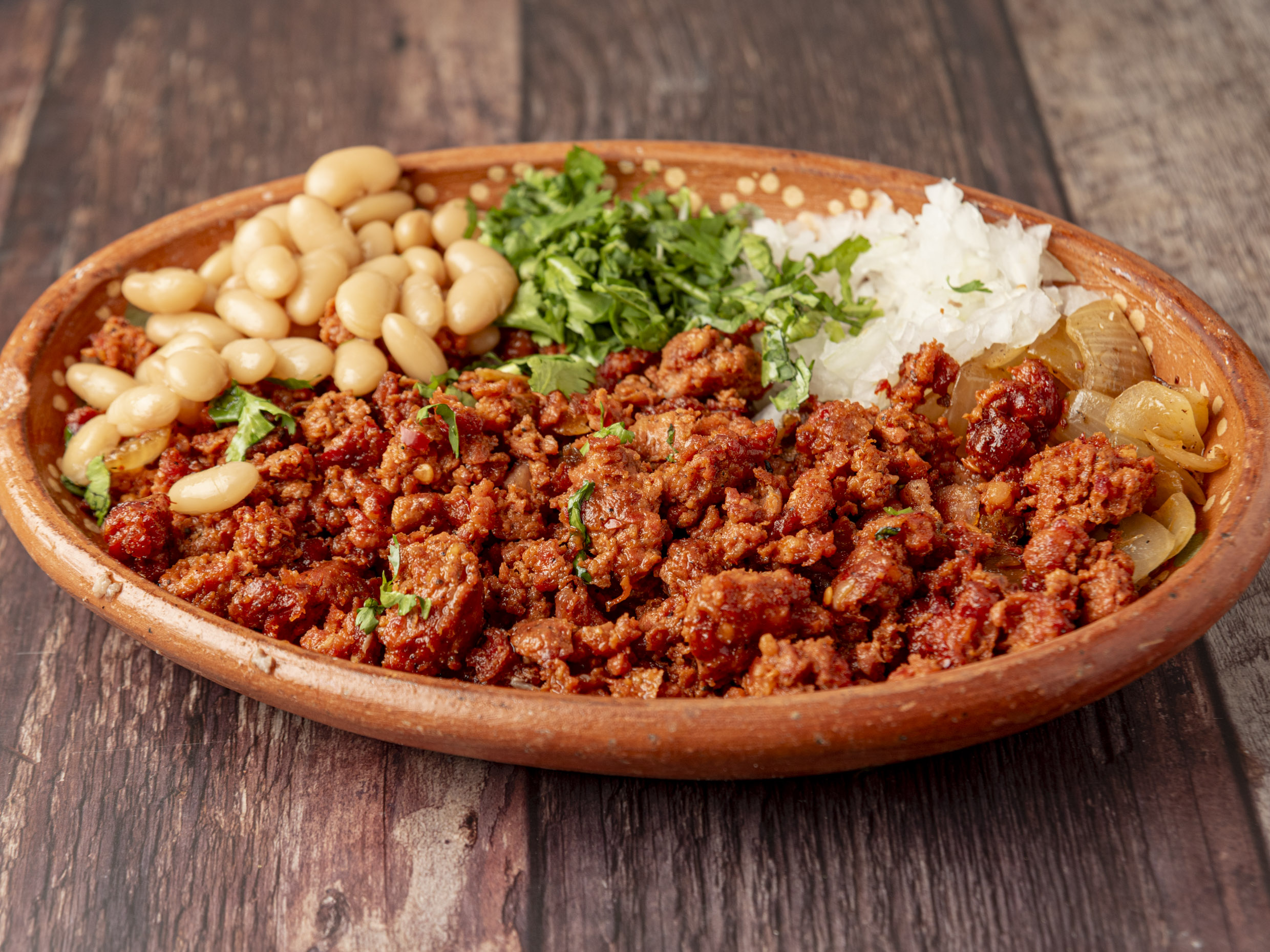 Contiene: chorizo, cebolla, cilantro,y frijoles de la olla y sus acompañantes salsa verde salsa roja, rábanos y limon