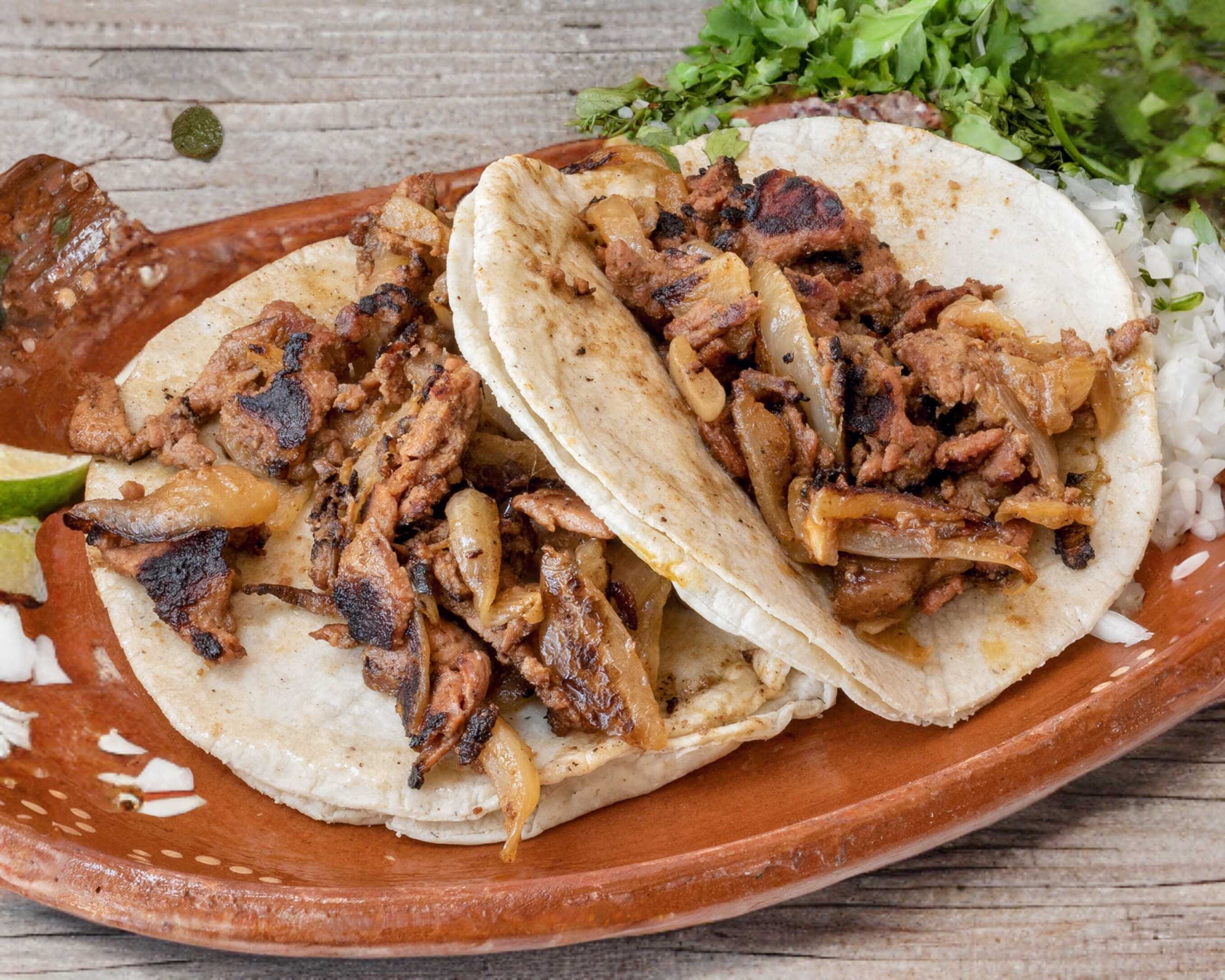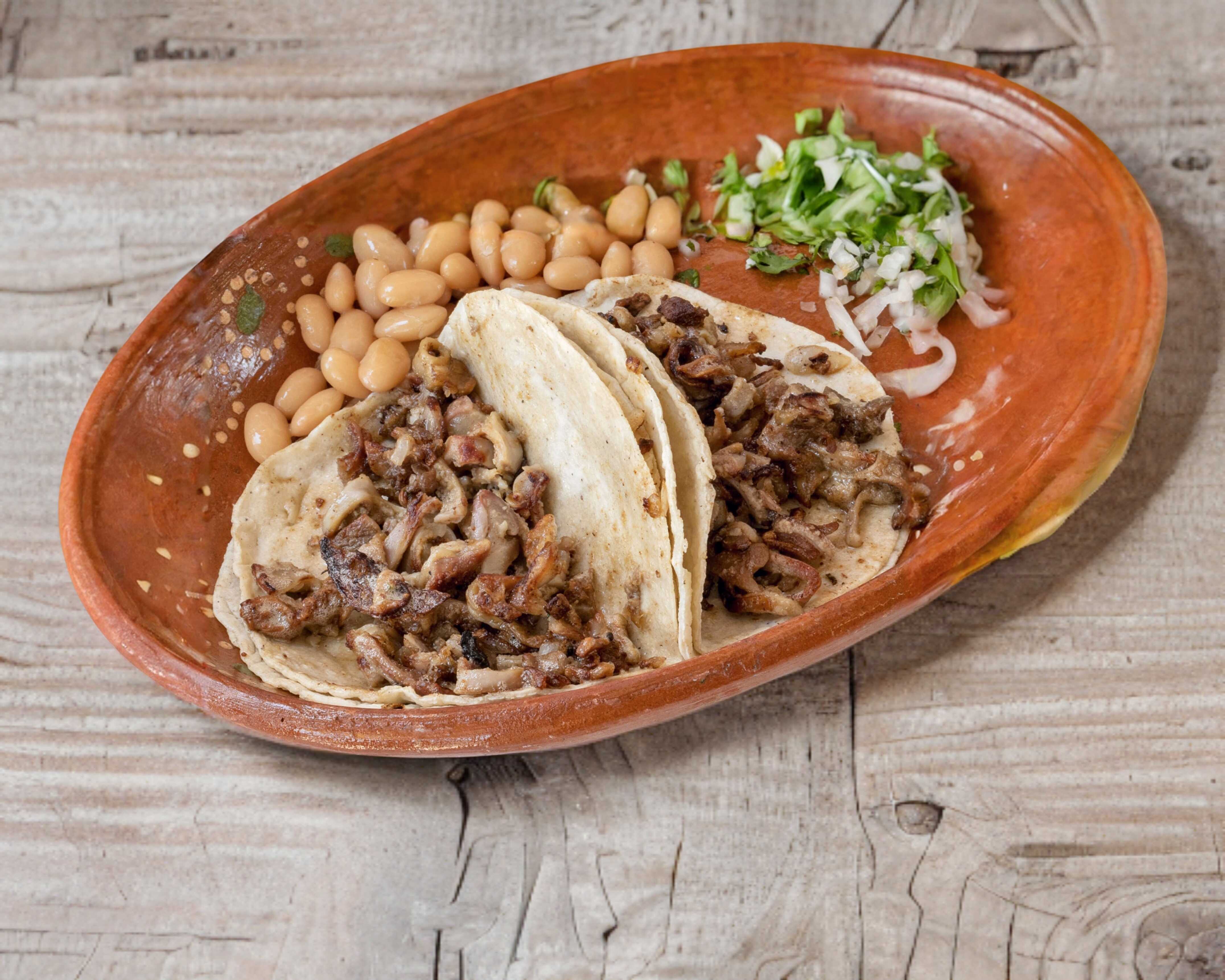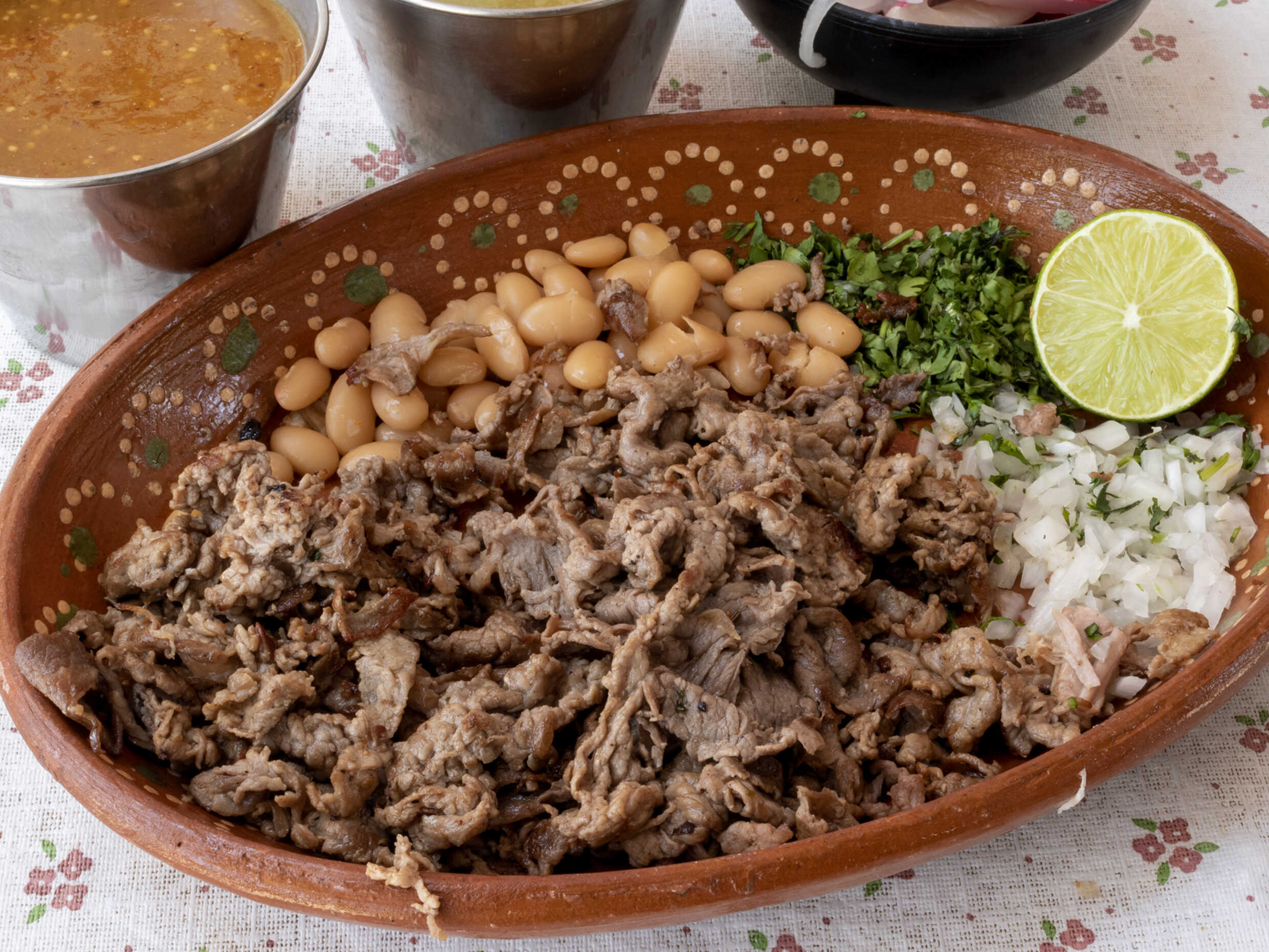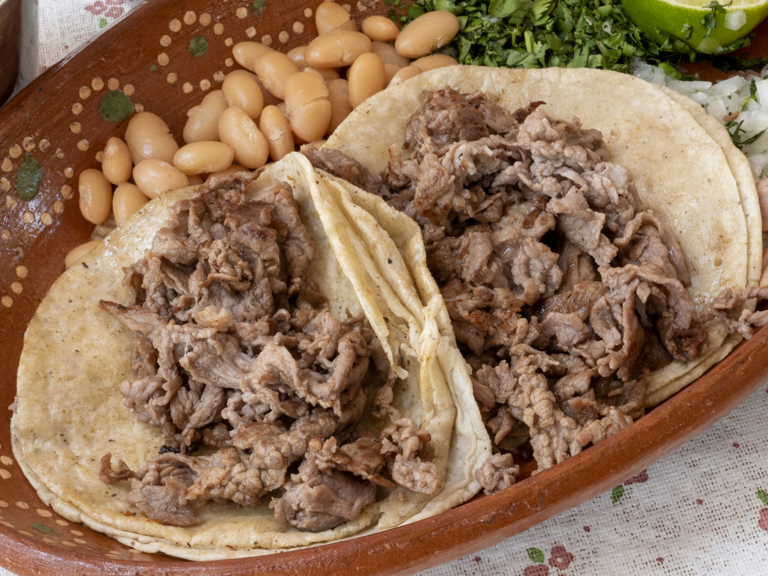 Orden de bistec incluye tortillas, cebolla, cilantro, frijoles, salsa verde, chile, rábanos y limon