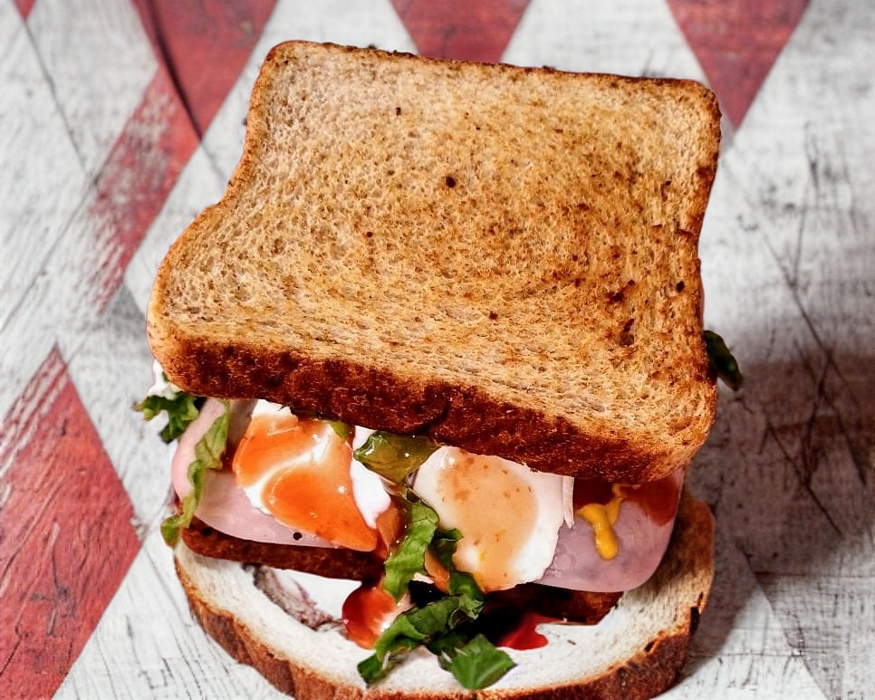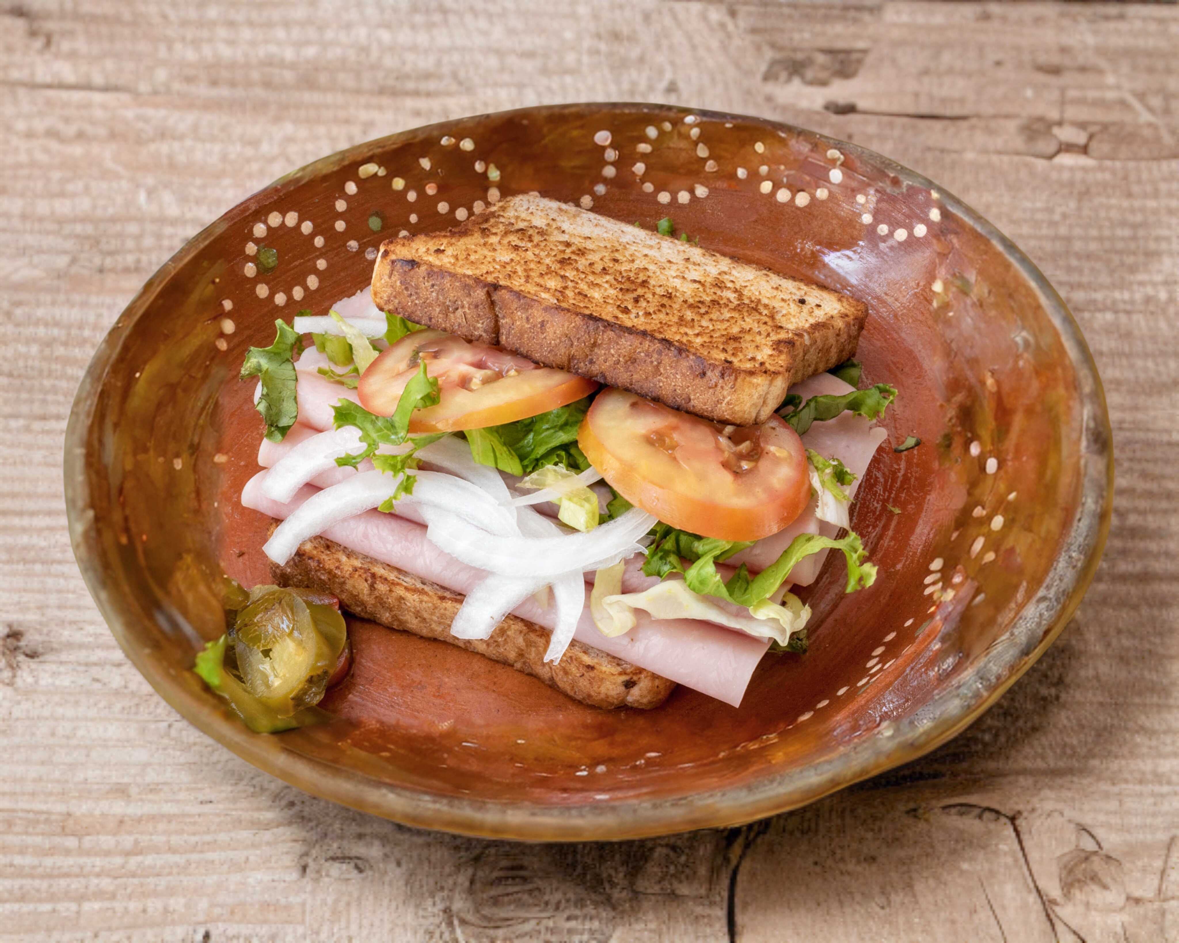 Este sándwich contiene: pan Bimbo integral, crema, jamón, jitomate, cebolla, chiles jalapeños, aguacate, catsup y mostaza