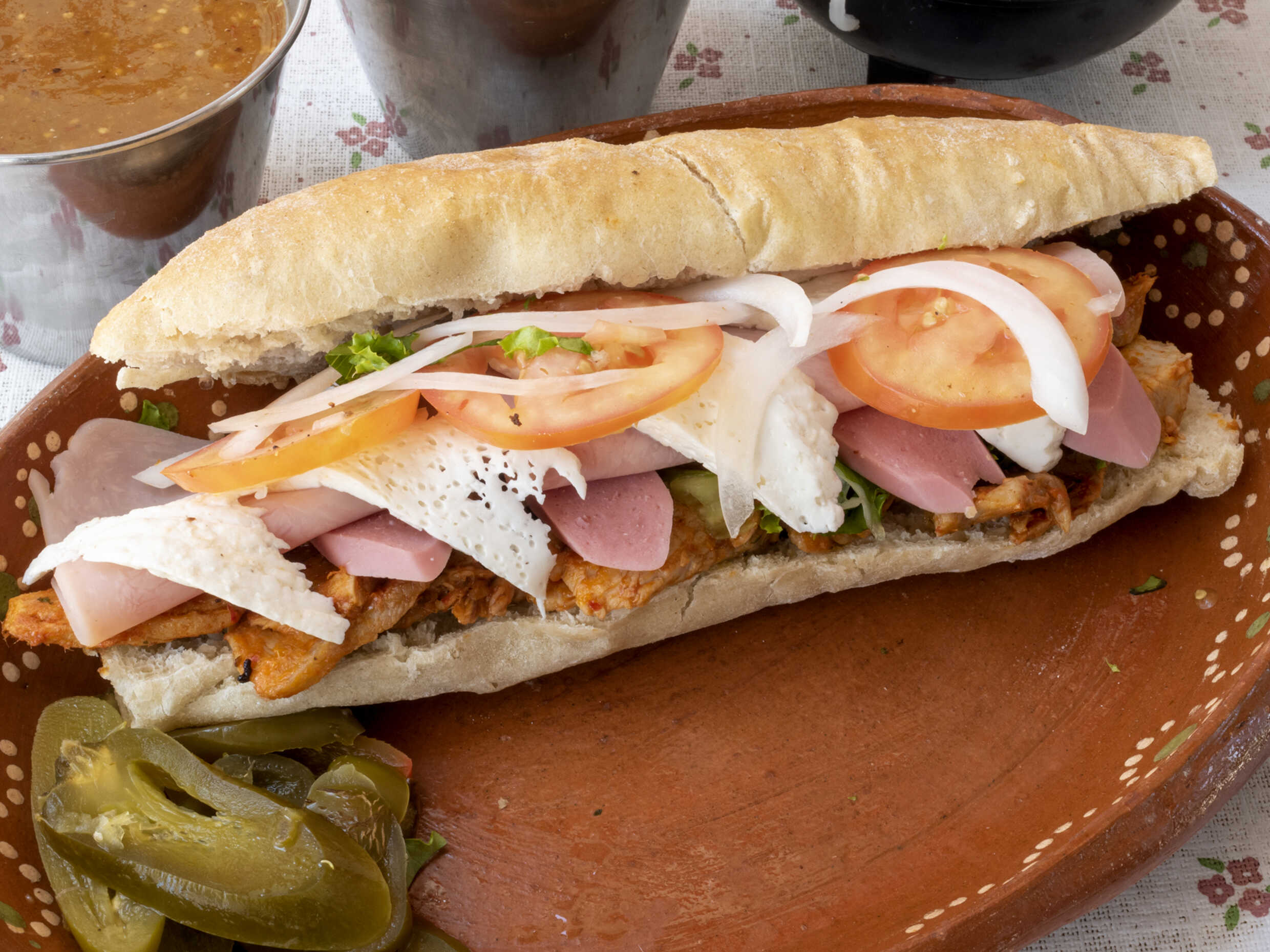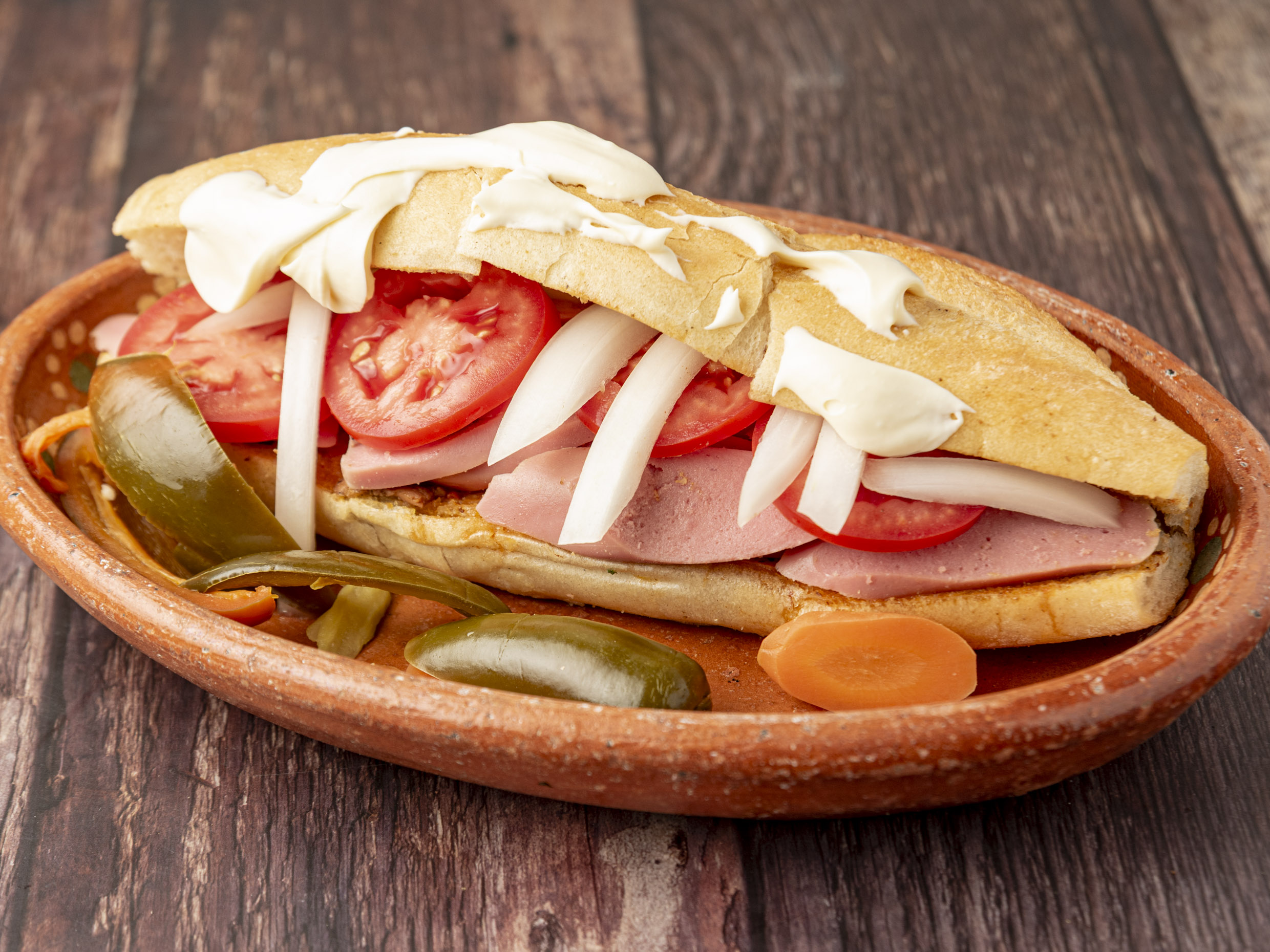 Este sándwich contiene: pan Bimbo integral, crema, pierna, jitomate, cebolla, chiles jalapeños, aguacate, catsup y mostaza
