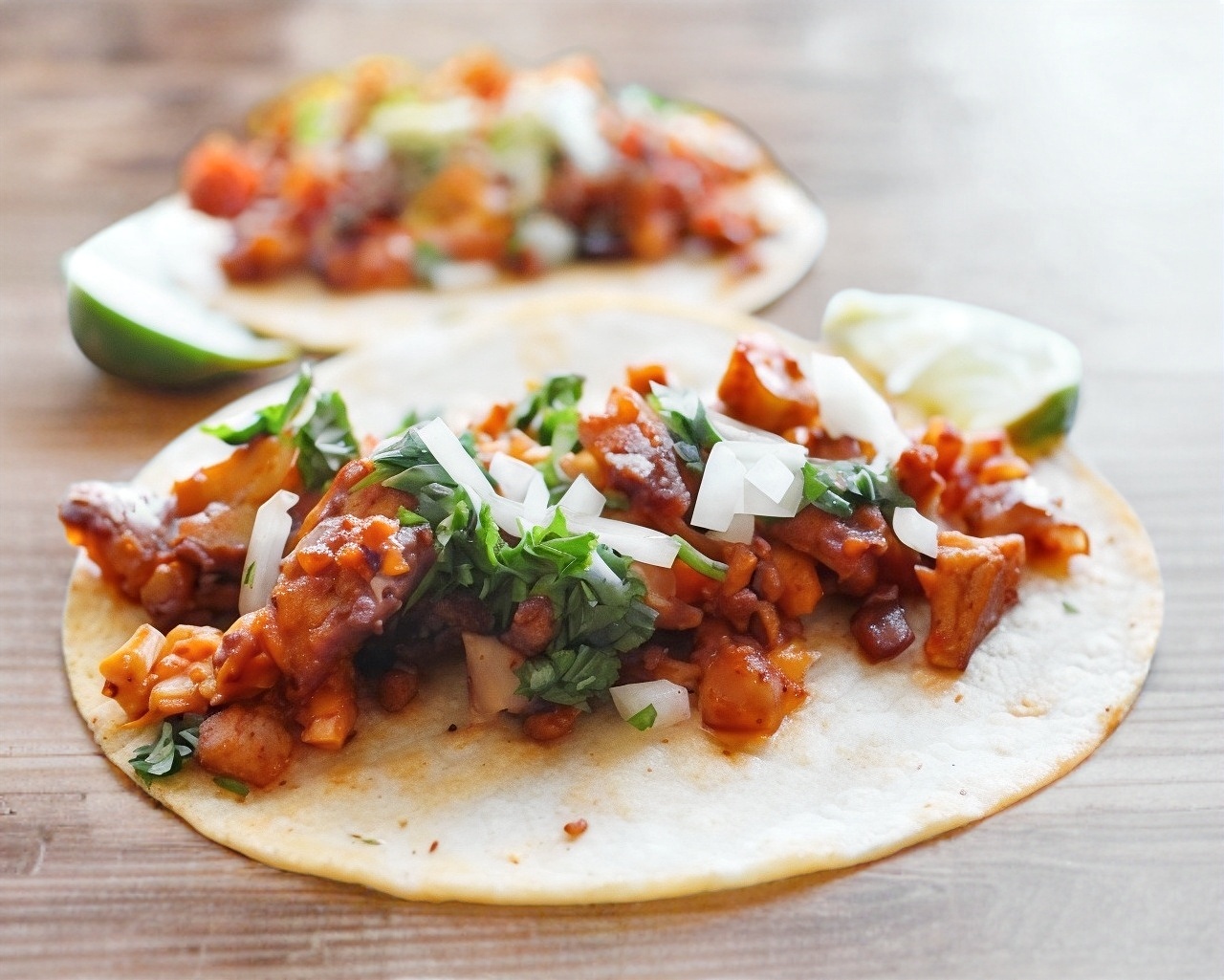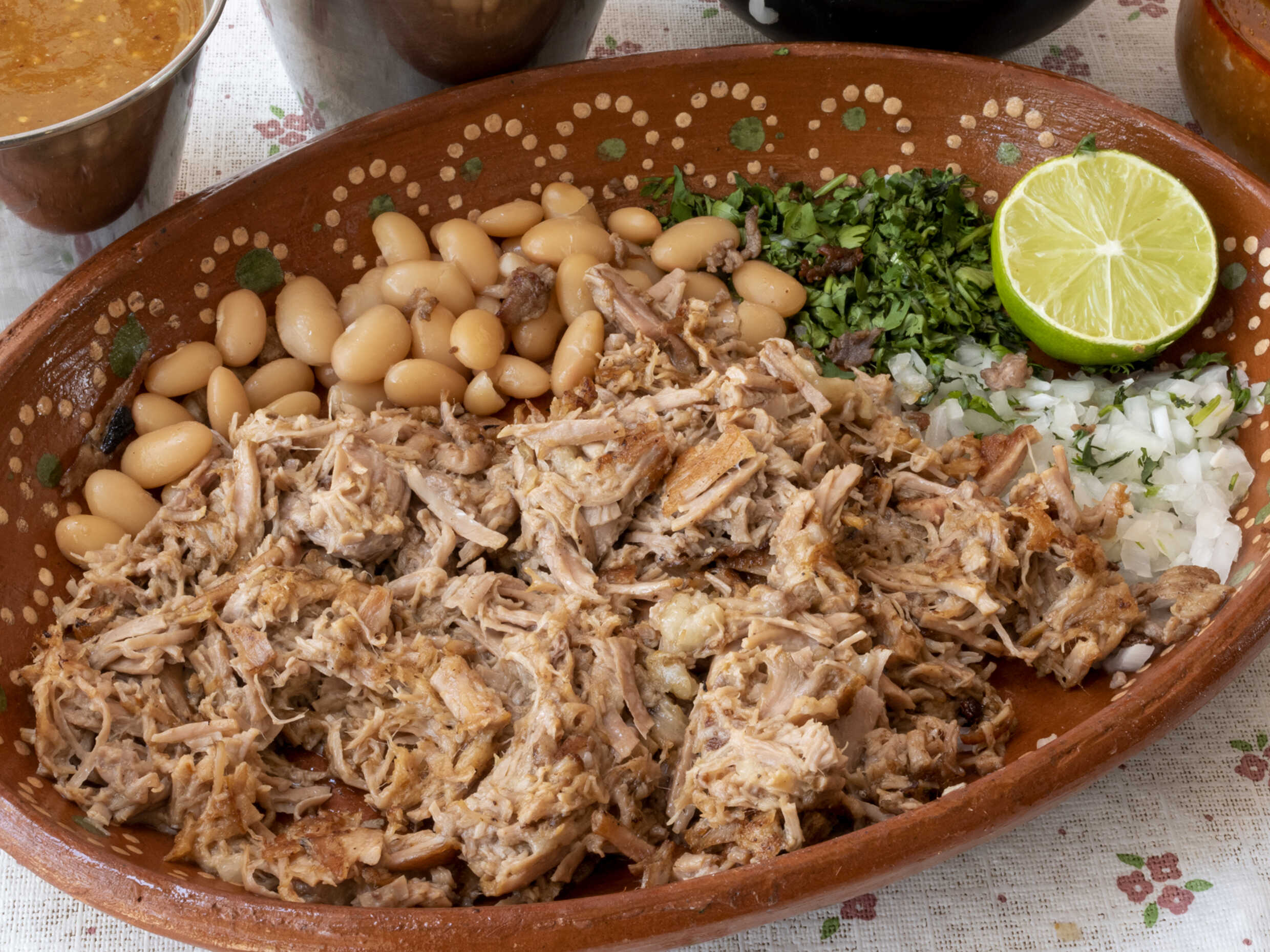 Orden de adobada, incluye tortillas, cebolla, cilantro, frijoles, salsa verde, chile, rábanos y limón