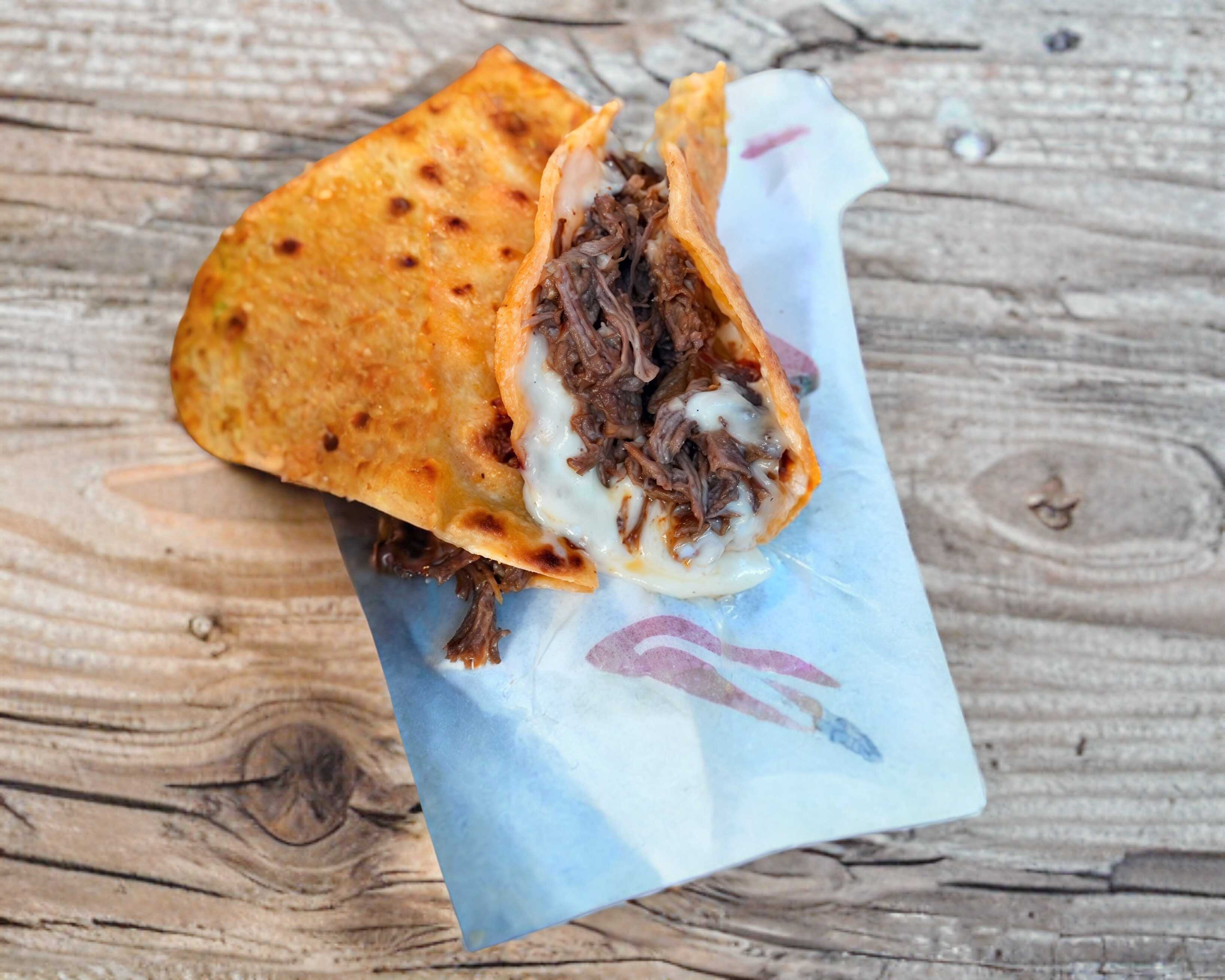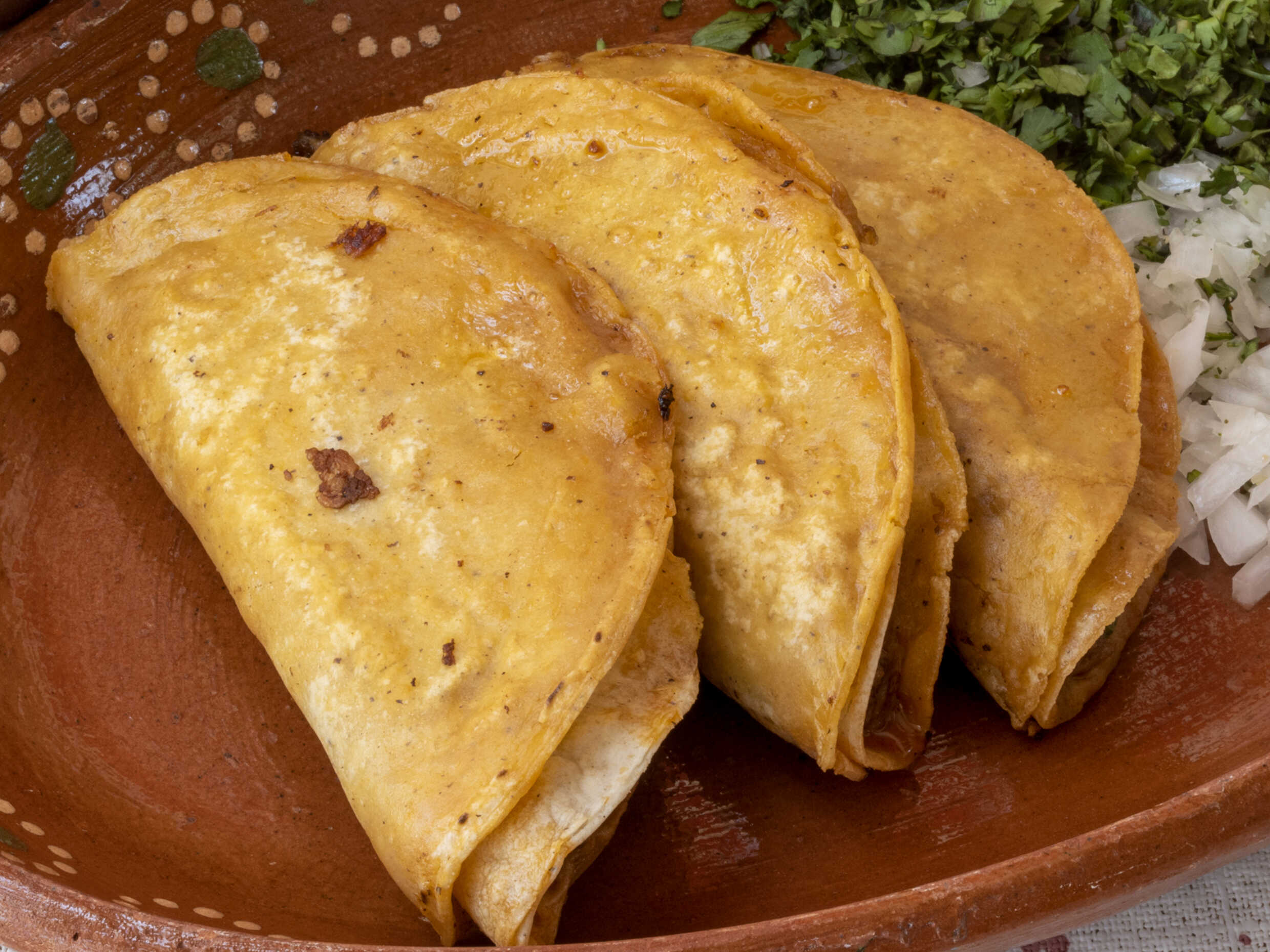 Taco dorado de barbacoa con queso blanco fundido, contiene: cebolla cilantro frijoles y sus complementos chile, salsa verde, rábanos y limón