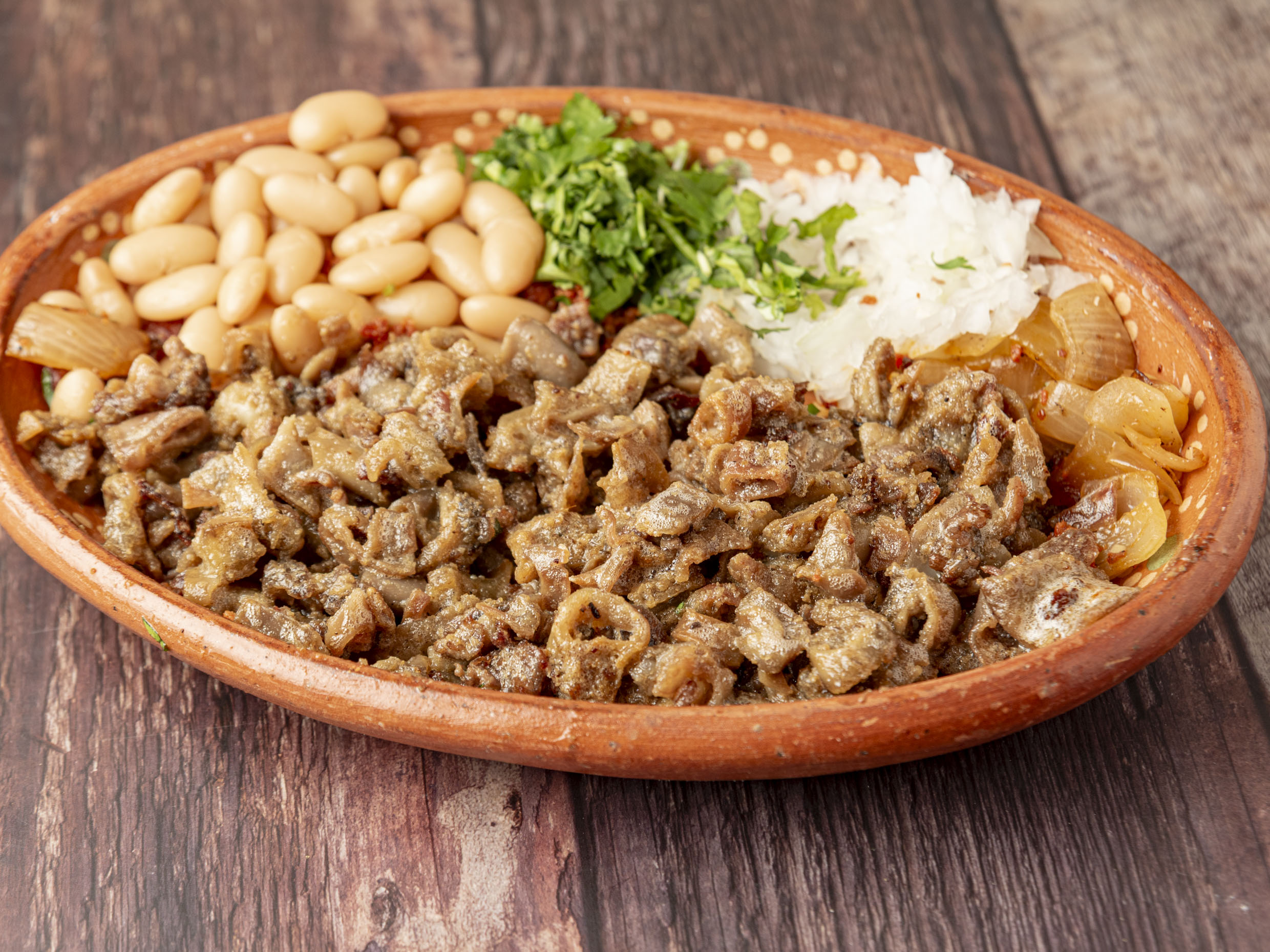 Orden De tripa, incluye tortillas, cebolla, cilantro, frijoles, salsa verde, chile, rábanos y limón