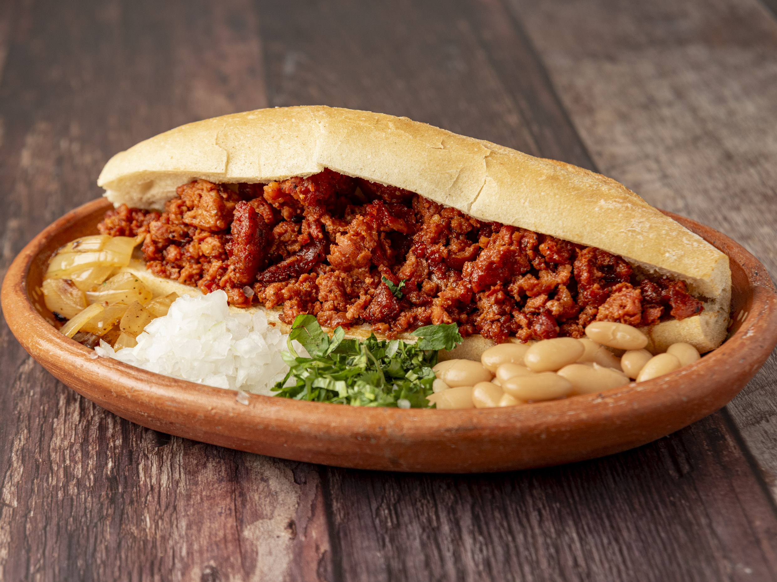 este lonche contiene: carne de bistec, chorizo, frijoles, cilantro, cebolla y sus complementos: chile, salsa verde, rábanos y limón