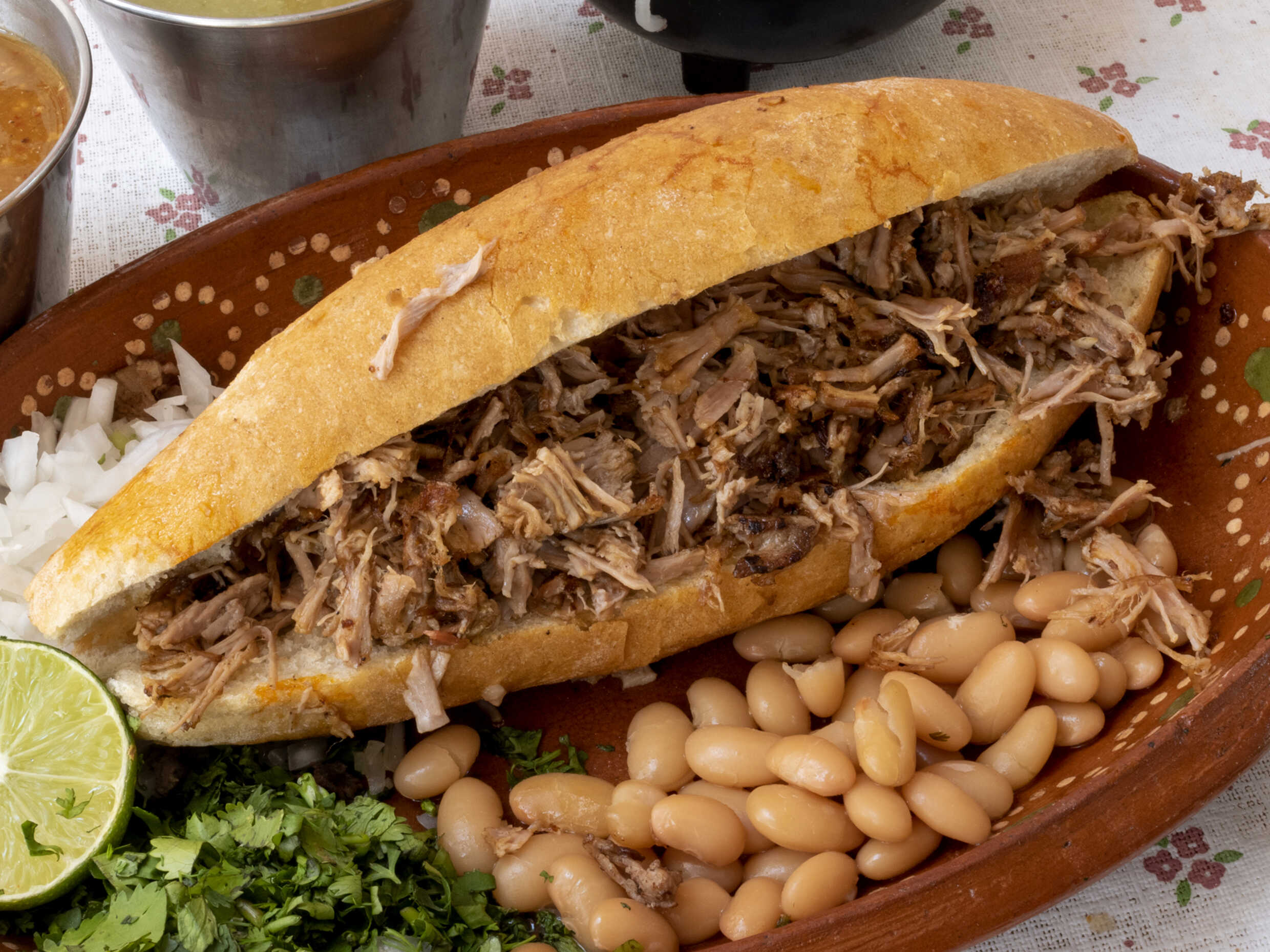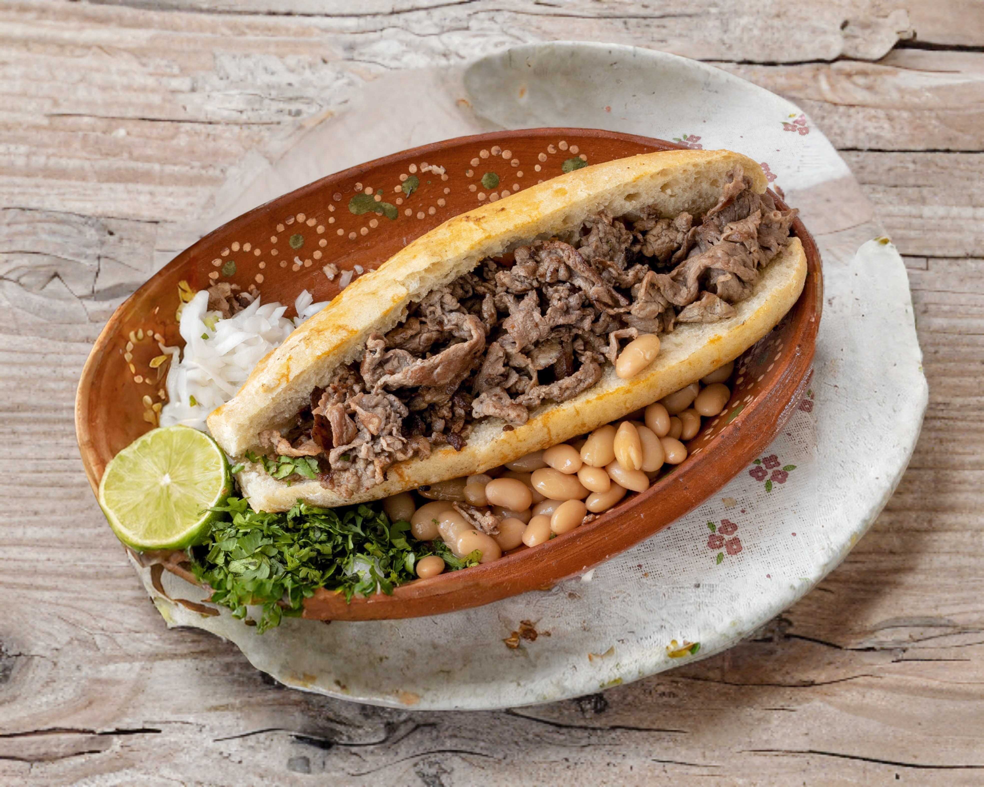 Este lonche contiene: birria de res, cebolla, cilantro, frijoles y sus complementos: chile, salsas, rábanos, limón