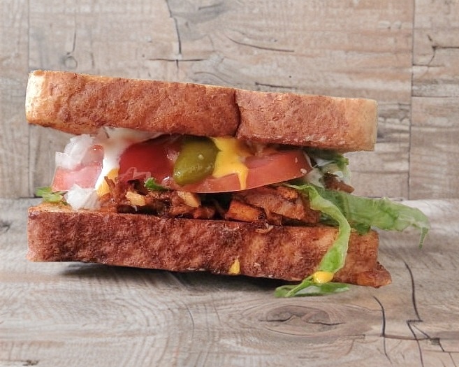 Este sándwich contiene: pan Bimbo integral, crema, panela, jitomate, cebolla, chiles jalapeños, aguacate, catsup y mostaza