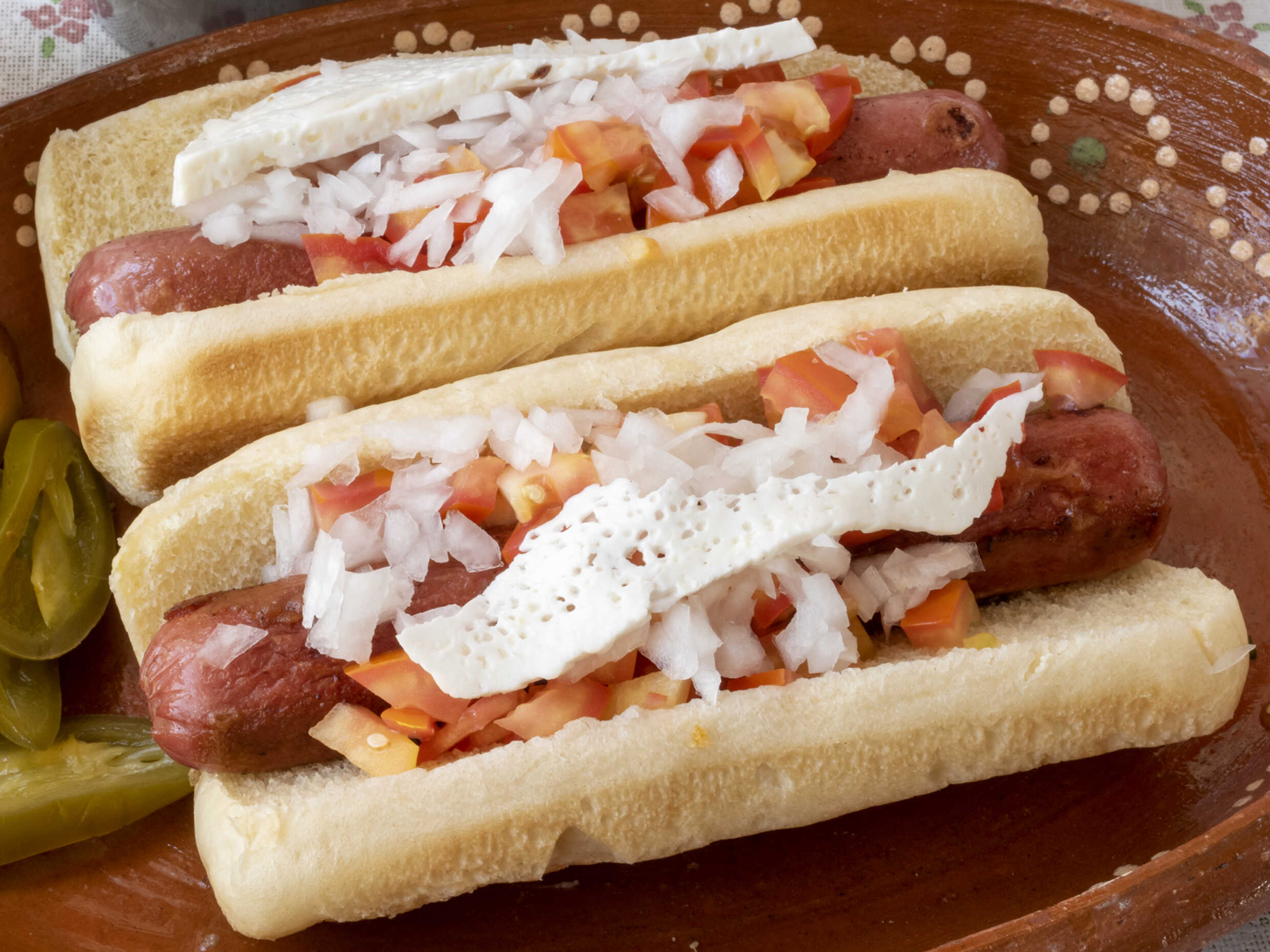 Este hot-dog contiene: pan medias noches, crema, salchicha, jitomate, cebolla, catsup, mostaza, panela y chiles jalapeños