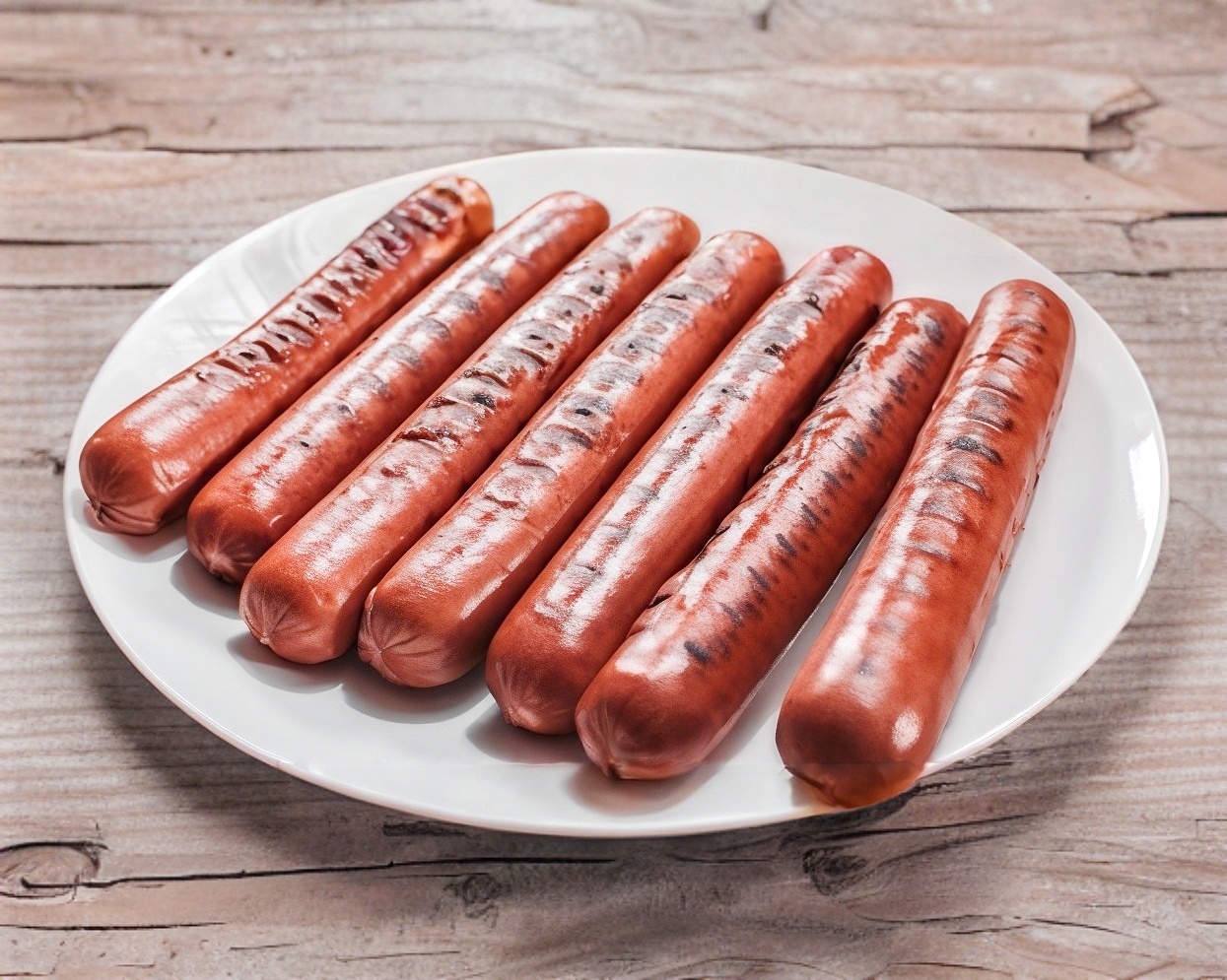 Salchicha con tocino dorada, picada en rodajas con catsup, mostaza y crema