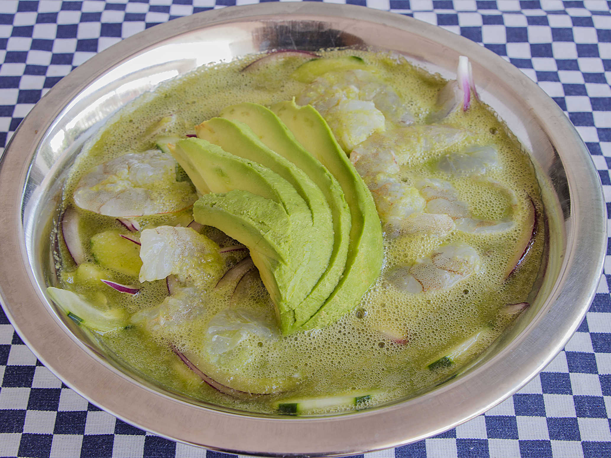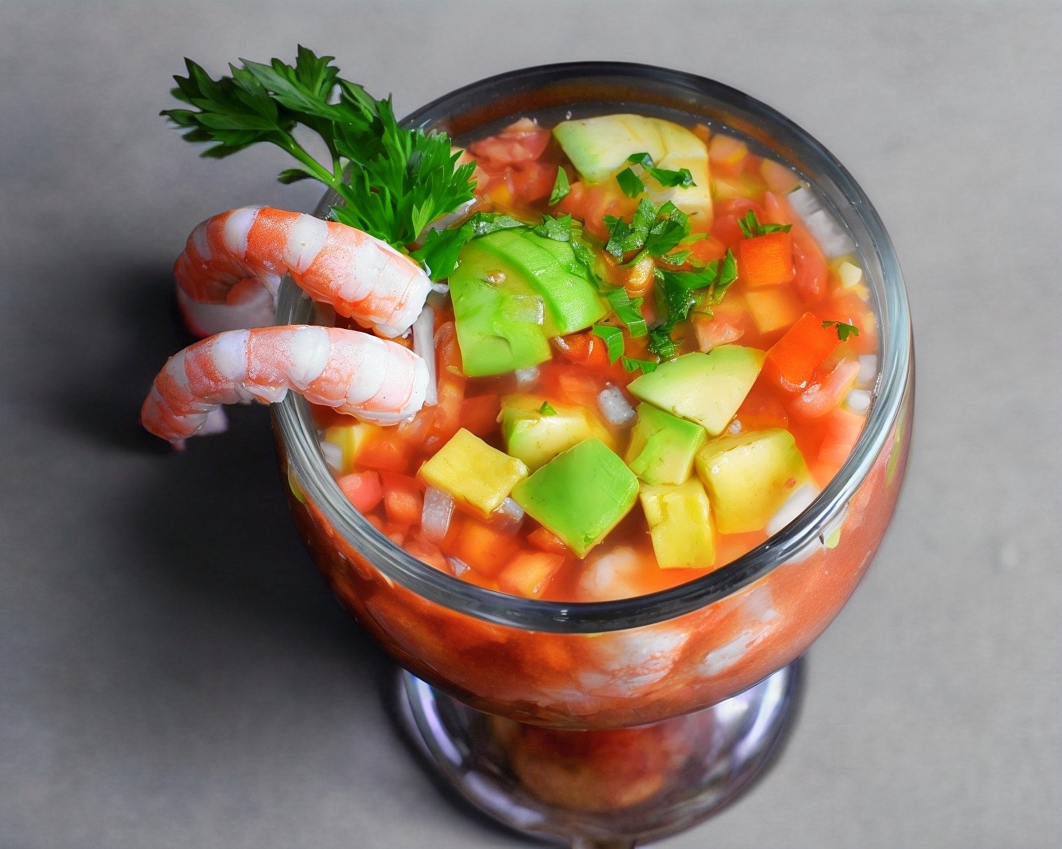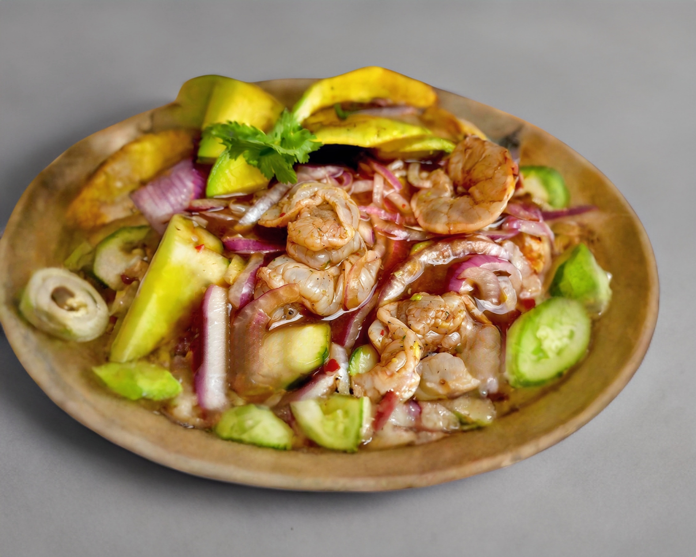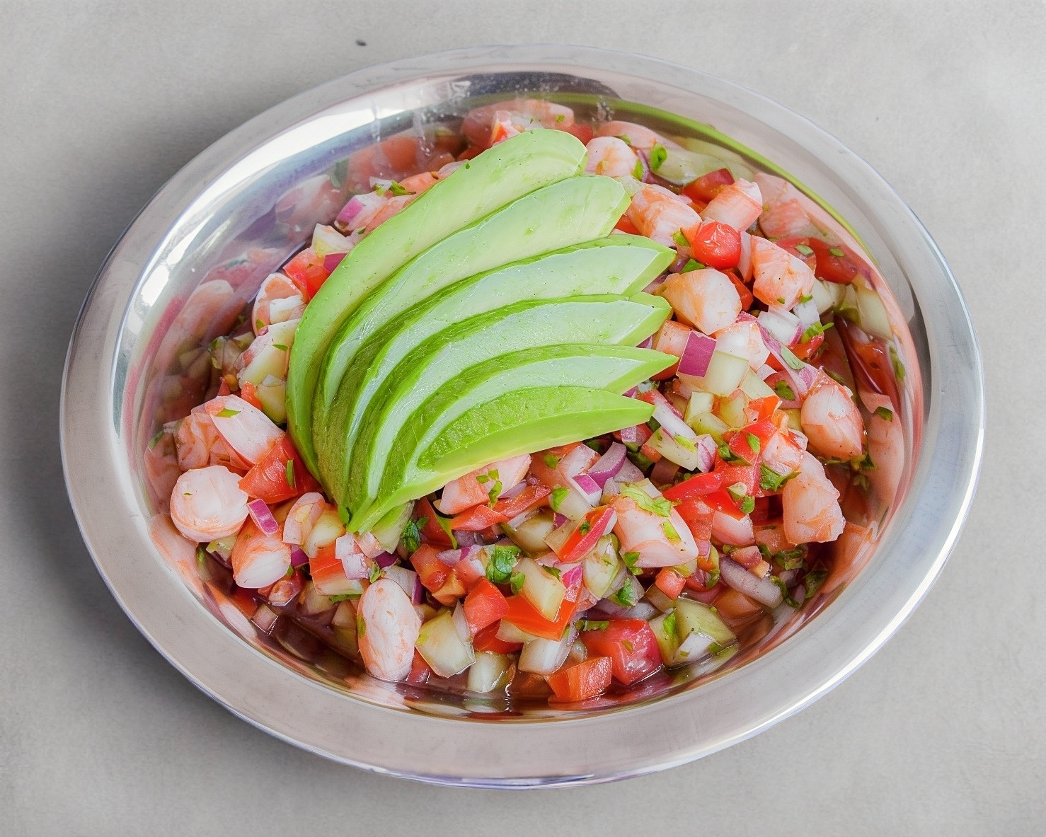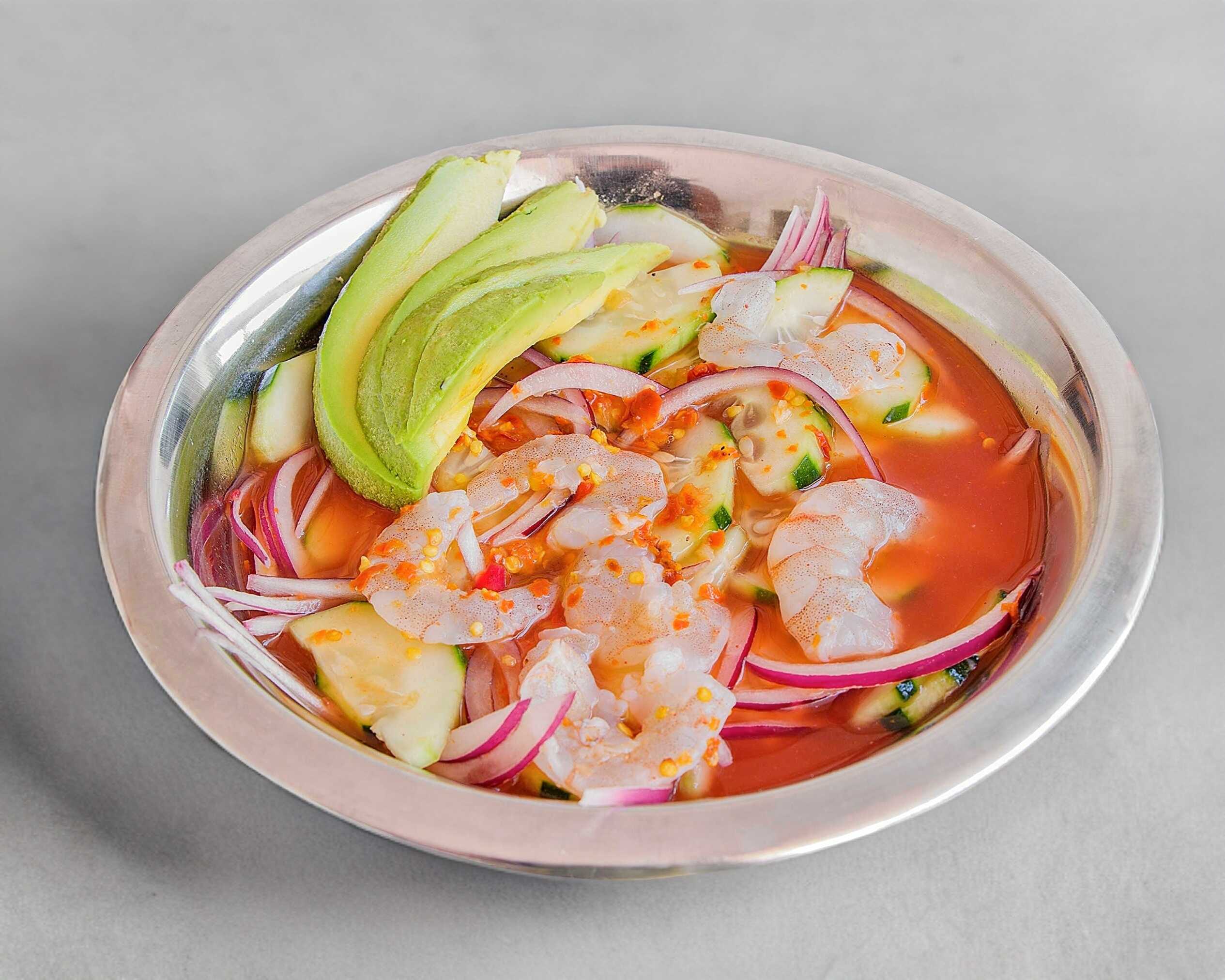Orden de coctel de camarón, acompañado de cebolla, jitomate y aguacate.