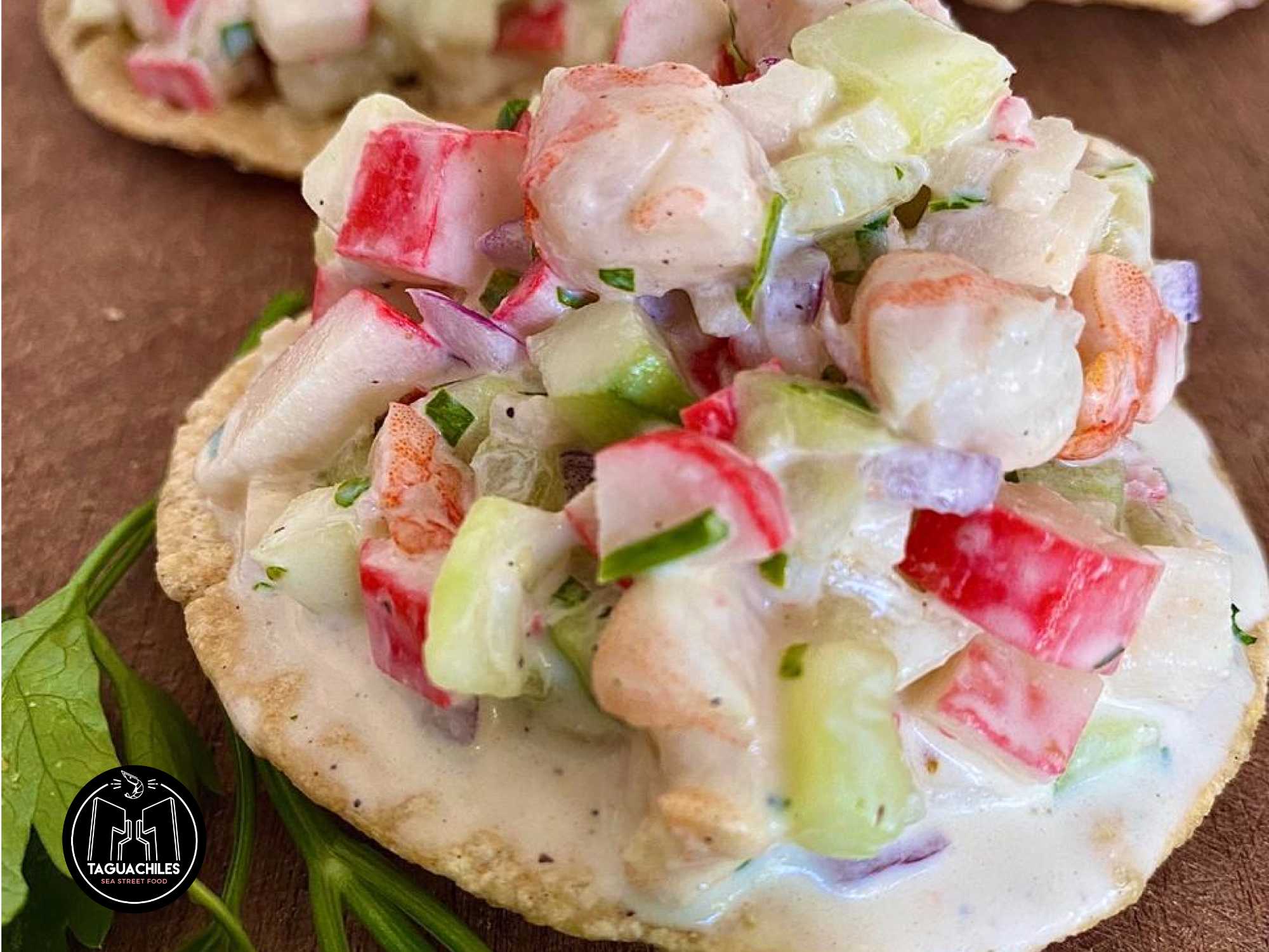 Aguachile a base de salsa macha, hecha con la mezcla de chiles secos de árbol y guajillo, con un toque de ajonjolí. ¡Muy Picante!