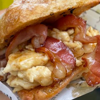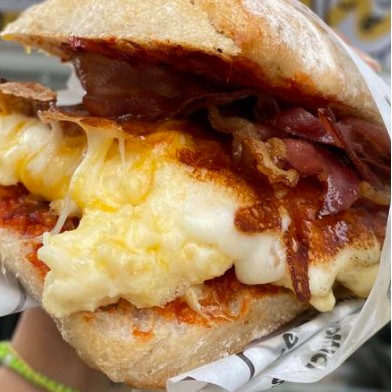 Pan crujiente, huevo esponjoso, mix de quesos, tocino doradito y una salsa kétchup de la casa.