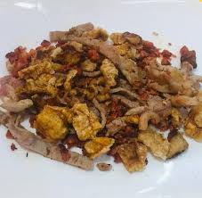 Morrón, cebolla, carne de res picada ,queso ,tortillas y hueso frito.