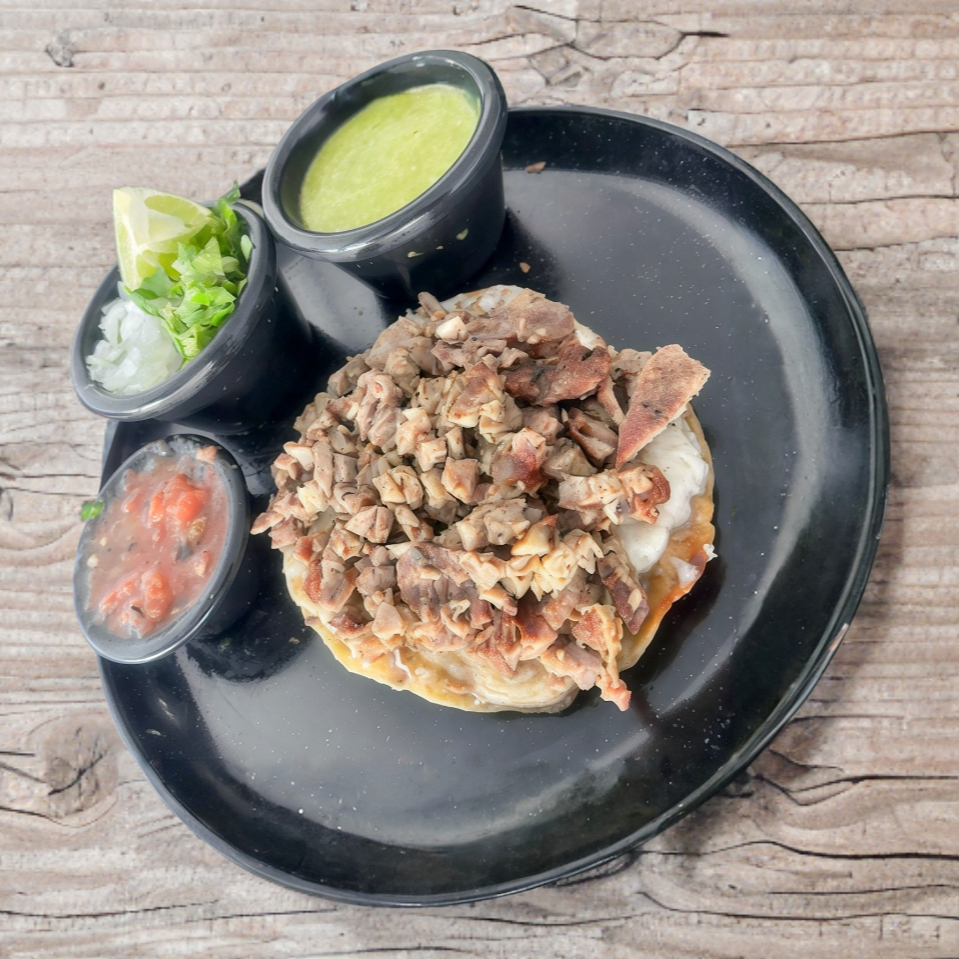 Tortilla de maíz dorada, queso de la casa, carne asada y chorizo.
