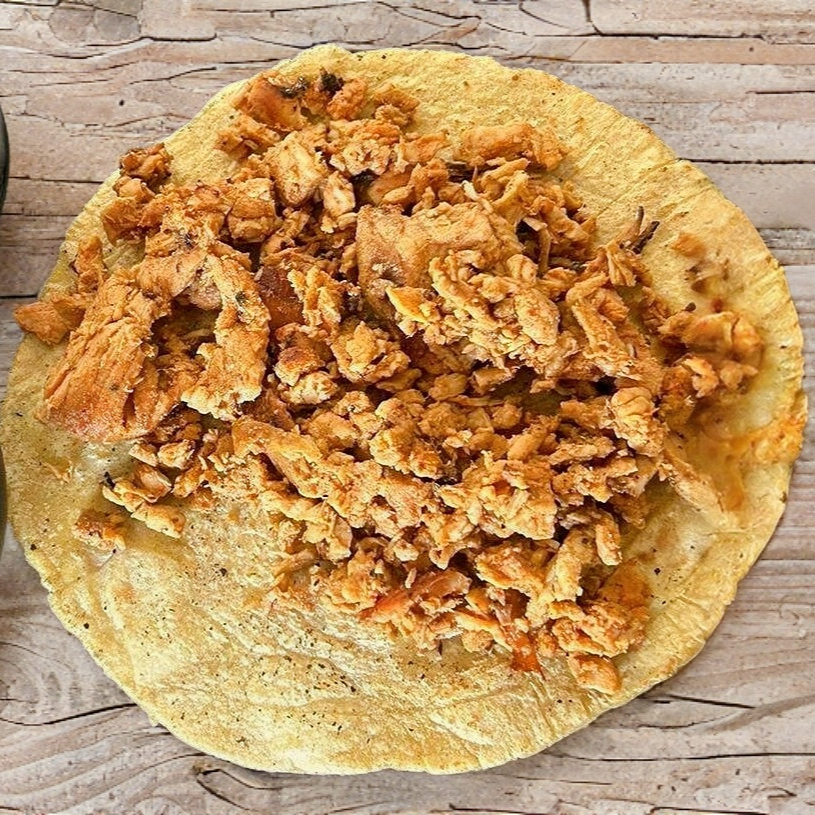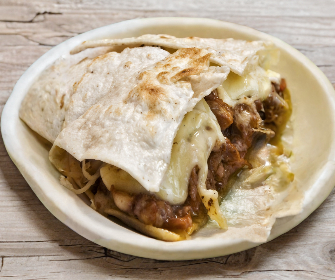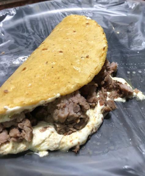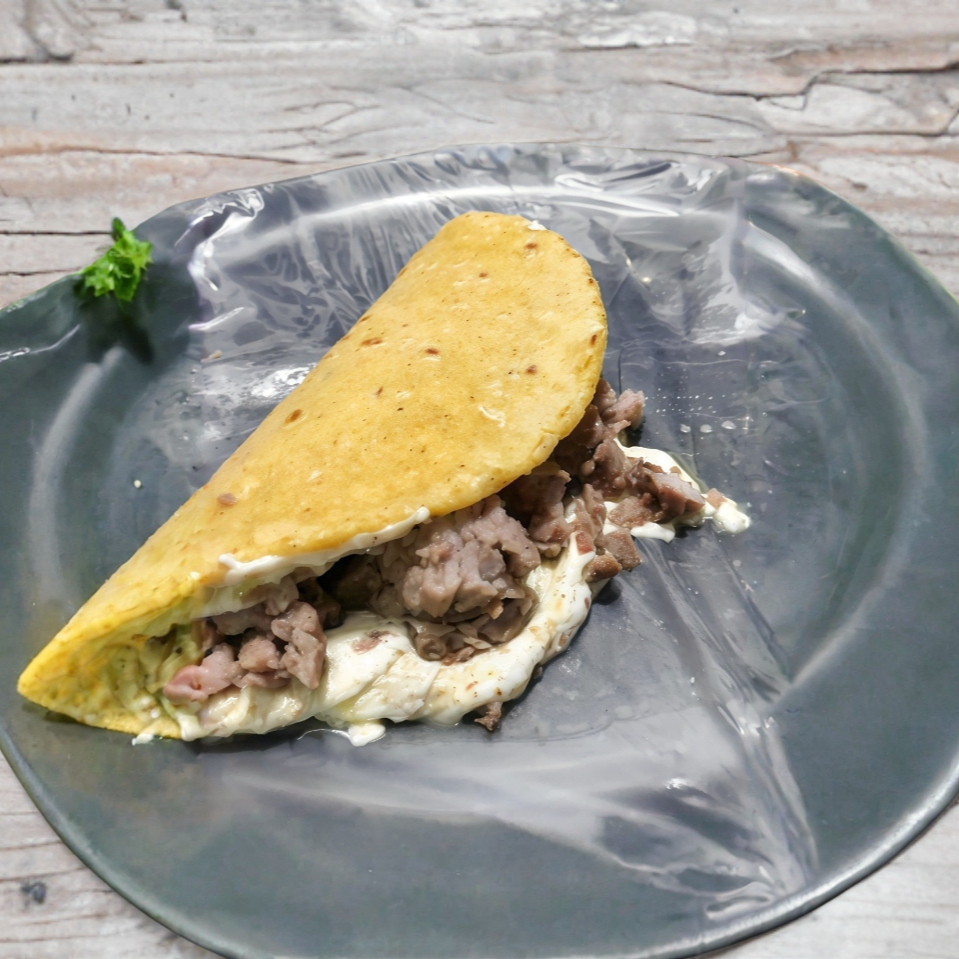 1 Tortilla de maíz o harina (harina mide 12 cm y de maíz es chica de 8 cm aprox), queso adobera de la casa y carne asada.( 45 a 50 gramos aprox).