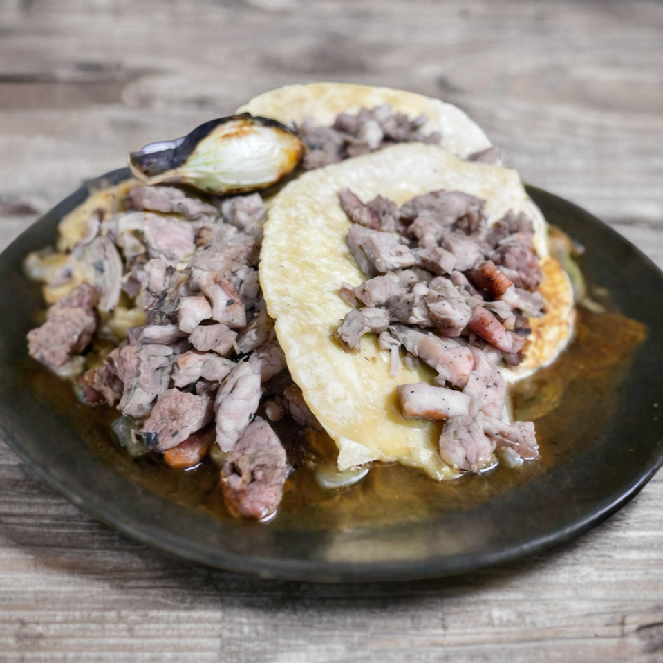 Tortilla de maíz dorada, queso de la casa y carne adobada.