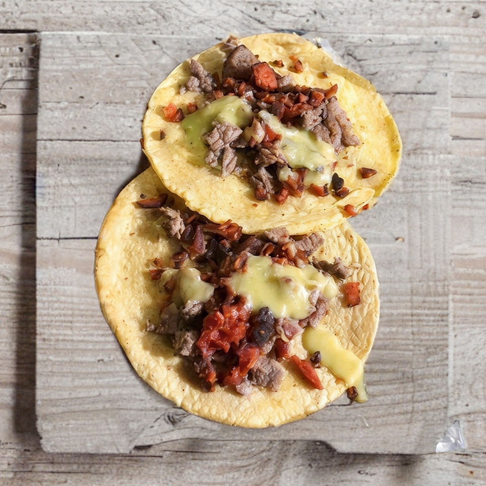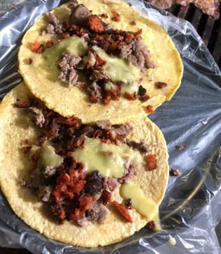 Tortilla de maíz dorada, queso de la casa con carne asada y chorizo.