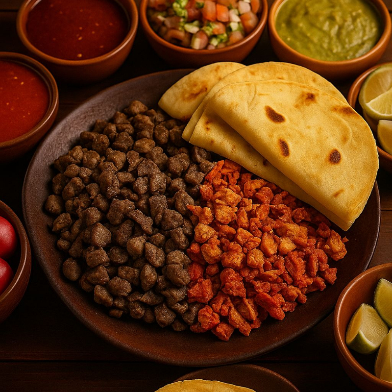 Tortilla de maíz recién hecha con carne asada y chorizo al carbón.