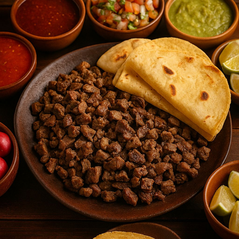 Tortilla de maíz recién hecha con carne adobada asada al carbón.