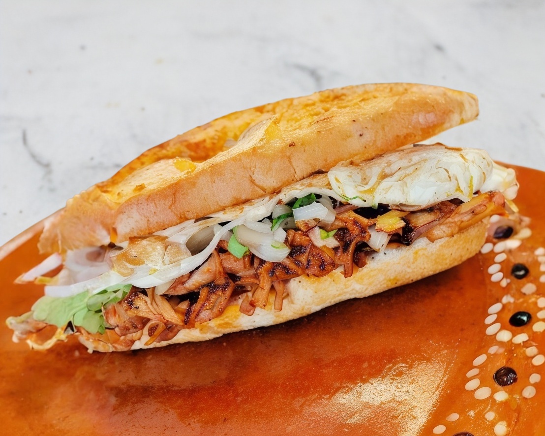 Bolillo fleiman casero con barbacoa especial preparada al día, acompañado de verduras y salsas caseras.