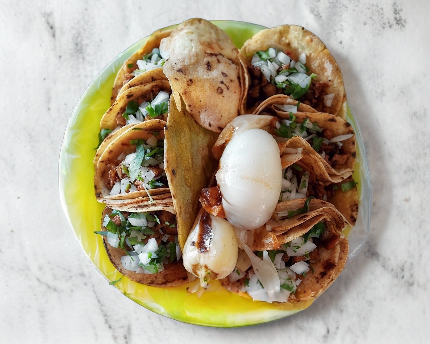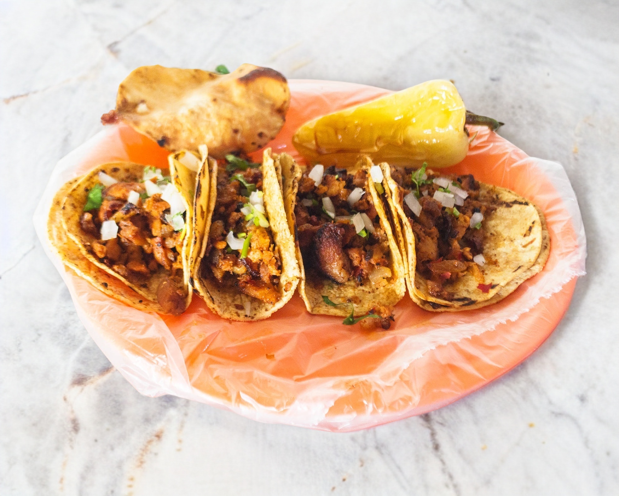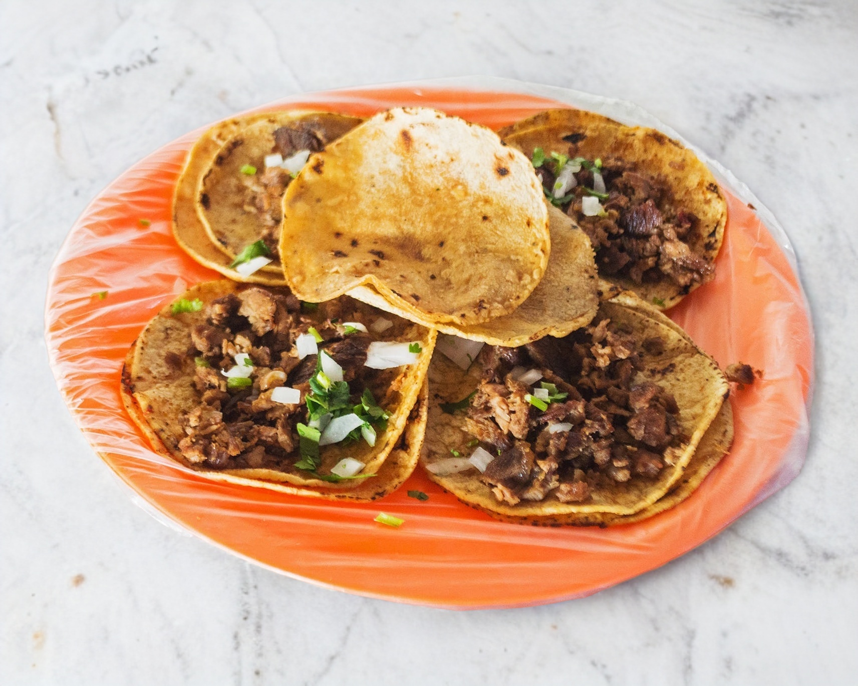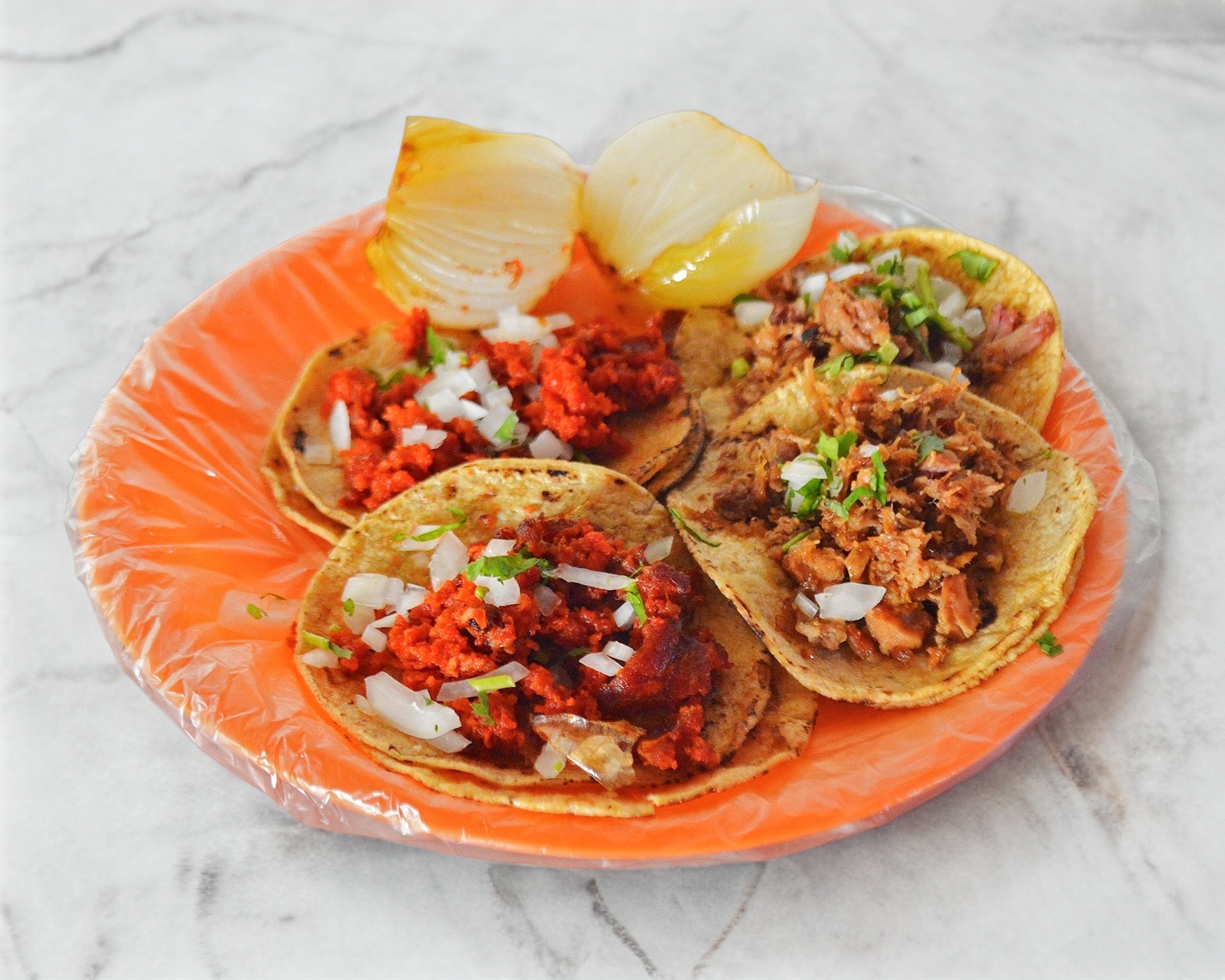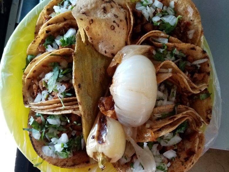cebolla , cilantro, cebolla guisada, salsa verde, roja, guacamole