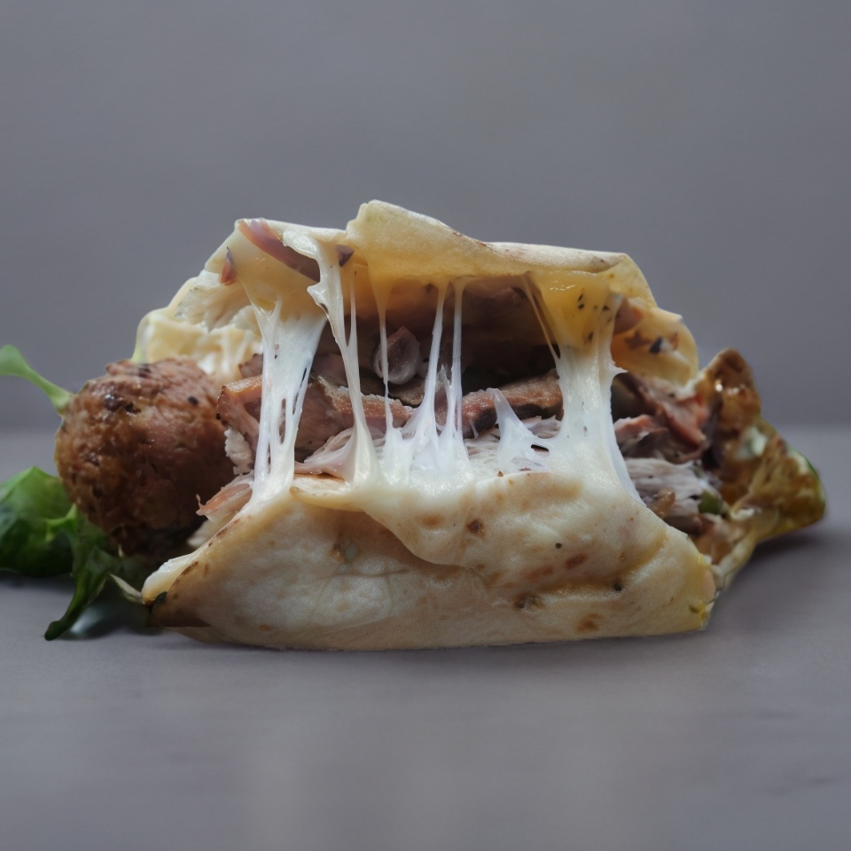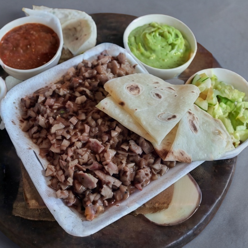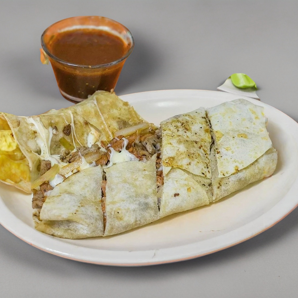 Bistec, chuleta, chorizo, tocino, morrón, cebolla, jitomate, queso.