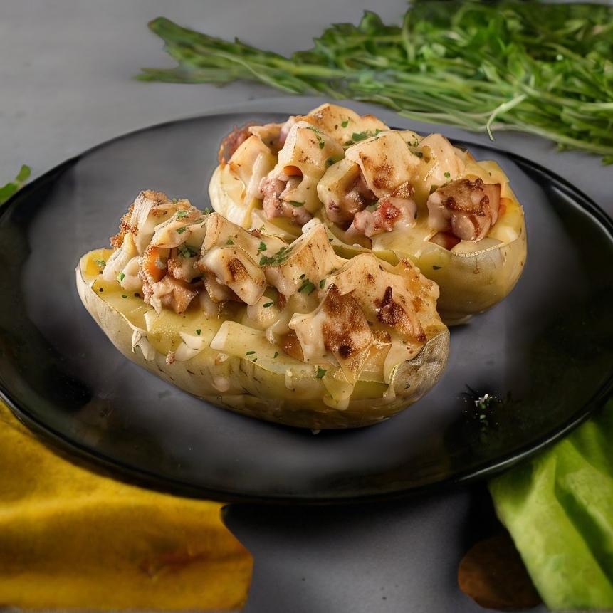 Chuleta, tocino, jamón, morrón, cebolla, piña y queso.