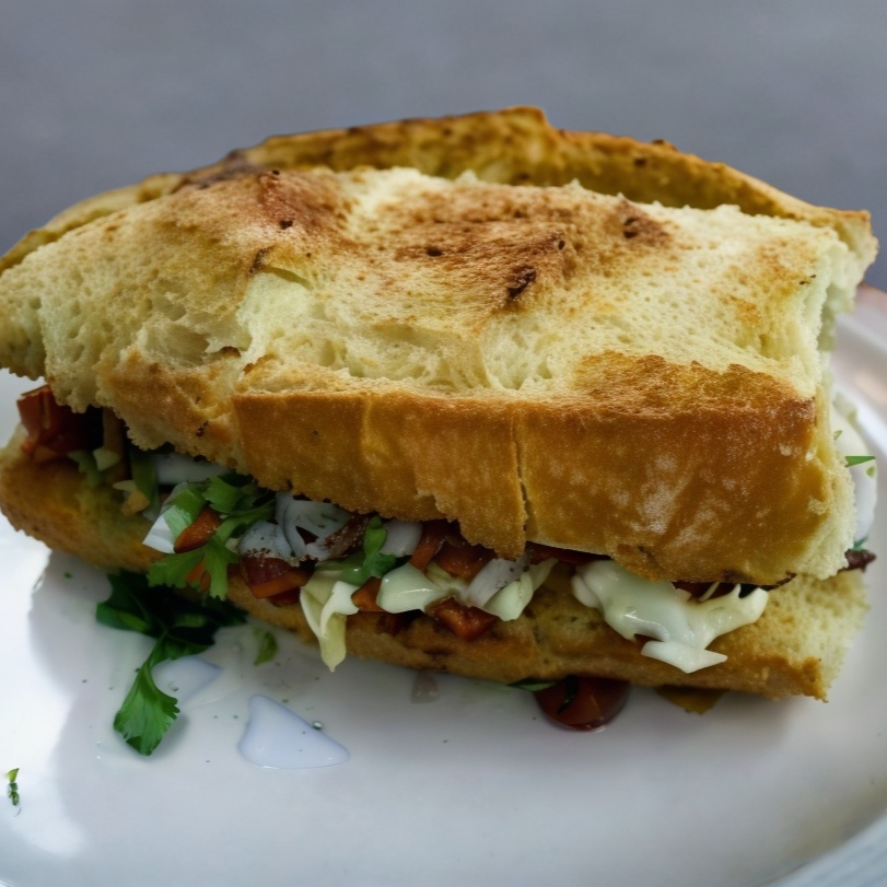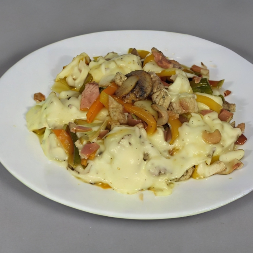 Bistec, tocino, jamón, cebolla, champiñón y queso.
