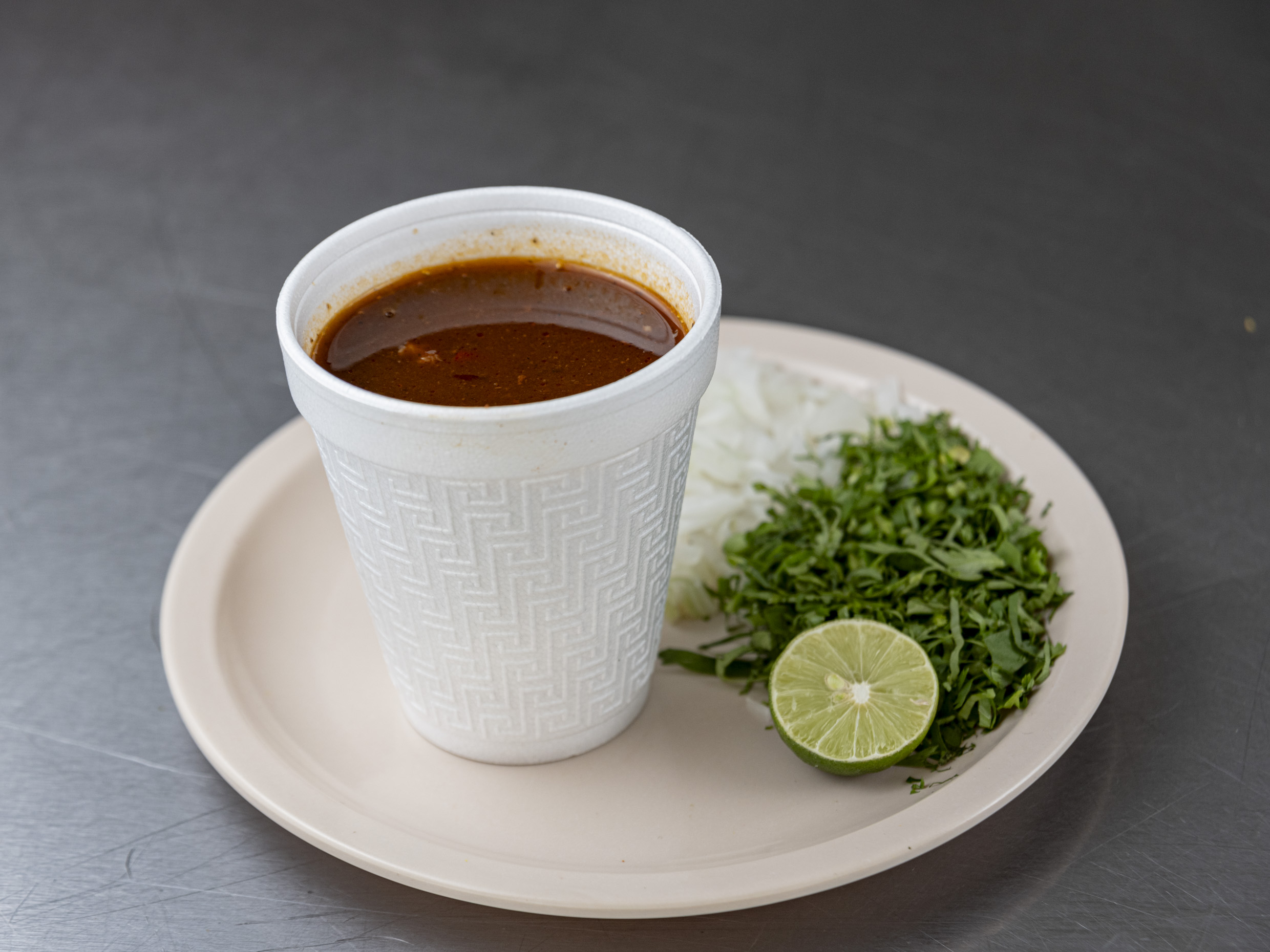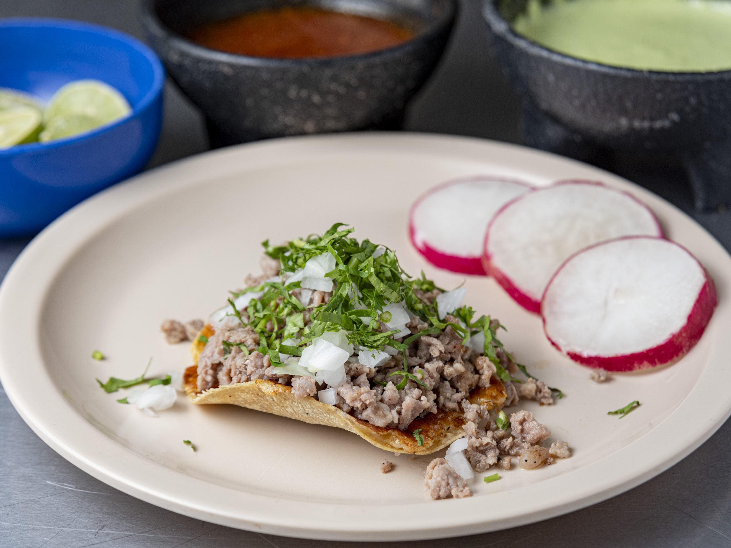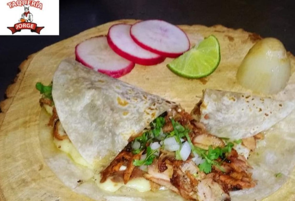 Tortilla de harina, queso fundido, carne al gusto, cebolla y cilantro.
