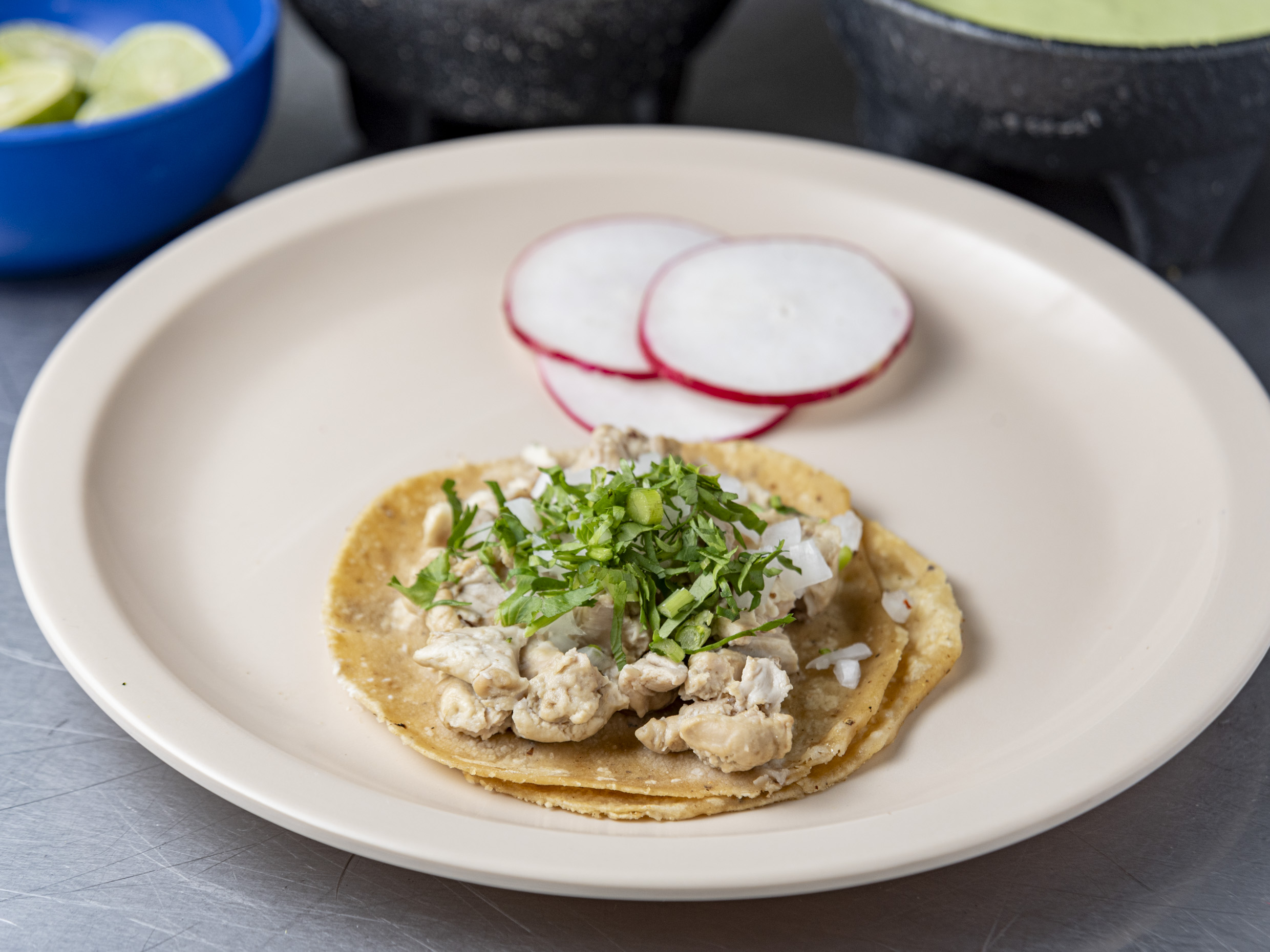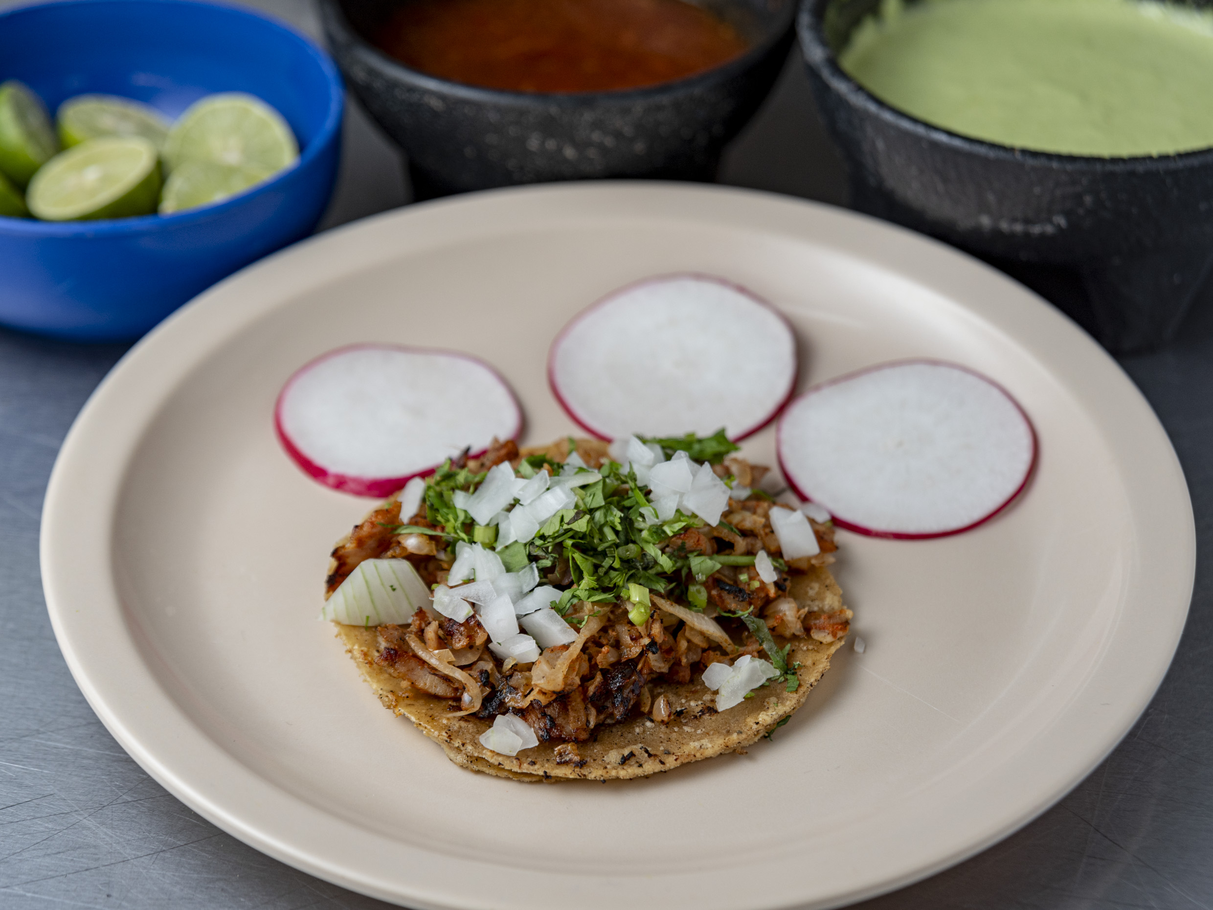 1 Tortilla de maíz mediana, queso fundido, carne a elegir, cebolla y cilantro.