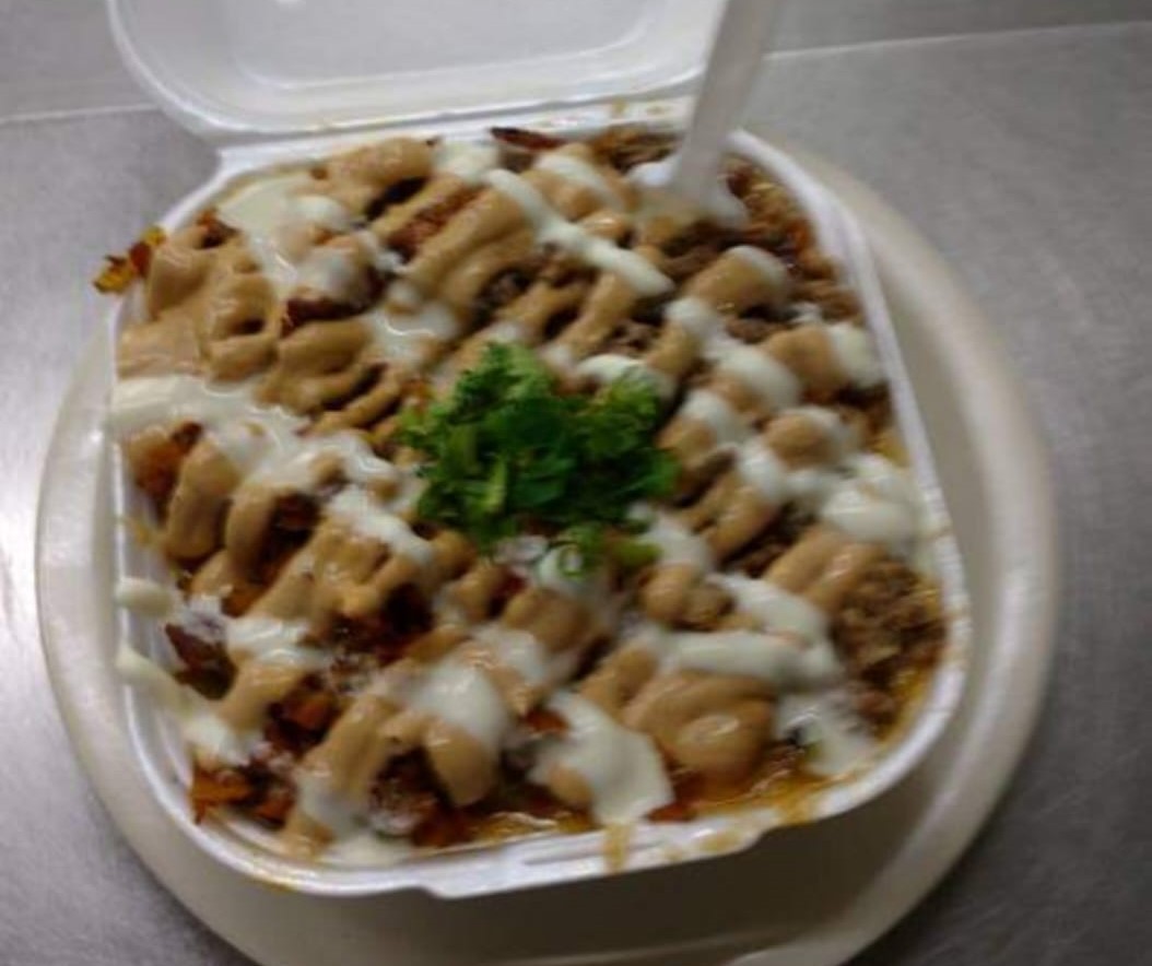 Papa, chile marrón, piña, mantequilla, salsa búfalo, tocino, queso fundido, carne al pastor acompañado de aderezo chipotle y crema.